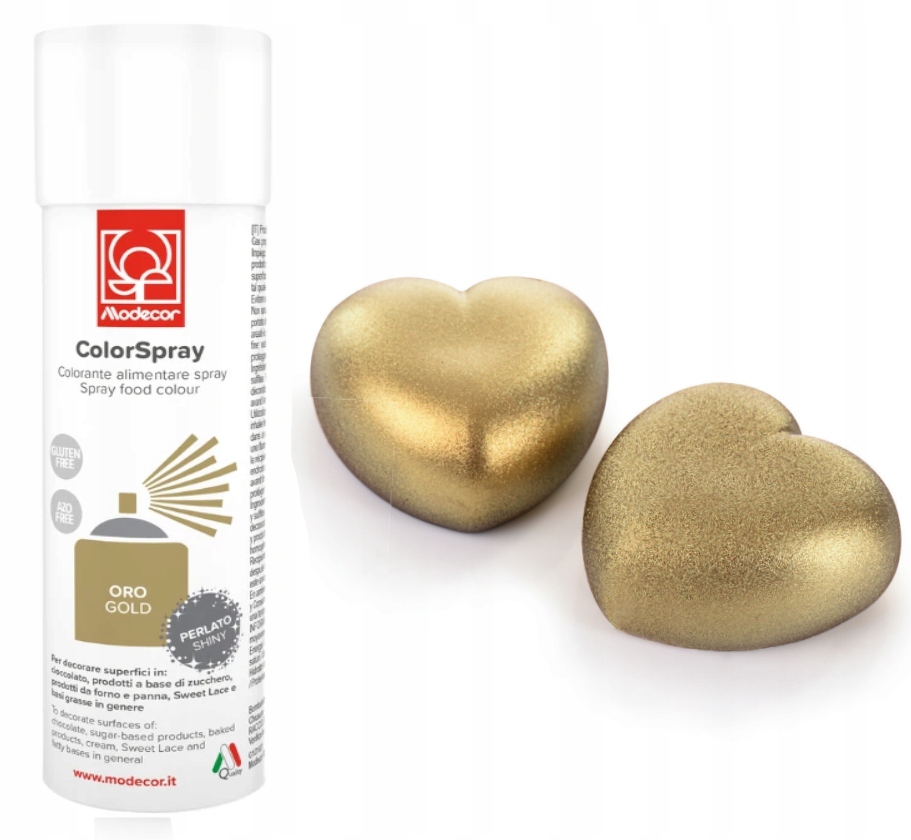 Sposób użycia: po dokładnym wstrząśnięciu należy rozpylić jednorodną warstwę produktu na dekorowanej powierzchni z odległości około 20 centymetrów (po każdym użyciu należy wyczyścić dozownik barwnika) – po udekorowaniu odczekać minimum 1 godzinę przed podaniem (spożyciem). Dozowanie (złotego barwnika) – 166.67 g/kg produktu końcowego.