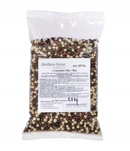 Mieszanka chrupiących kulek na bazie mąki ryżowej pokrytych czekoladą białą, mleczną i deserową. Czekoladowa otoczka chroni wnętrze kulek przed rozmiękaniem, dzięki czemu pozostają one cały czas chrupiące.