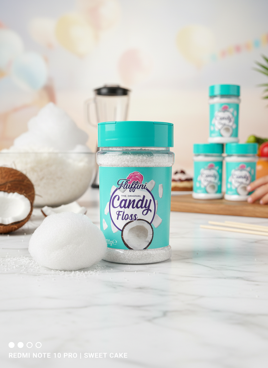 • Wystarczy wlać go do swojej maszyny do waty cukrowej i możesz cieszyć się prawdziwym doświadczeniem Fluffini za chwilę!