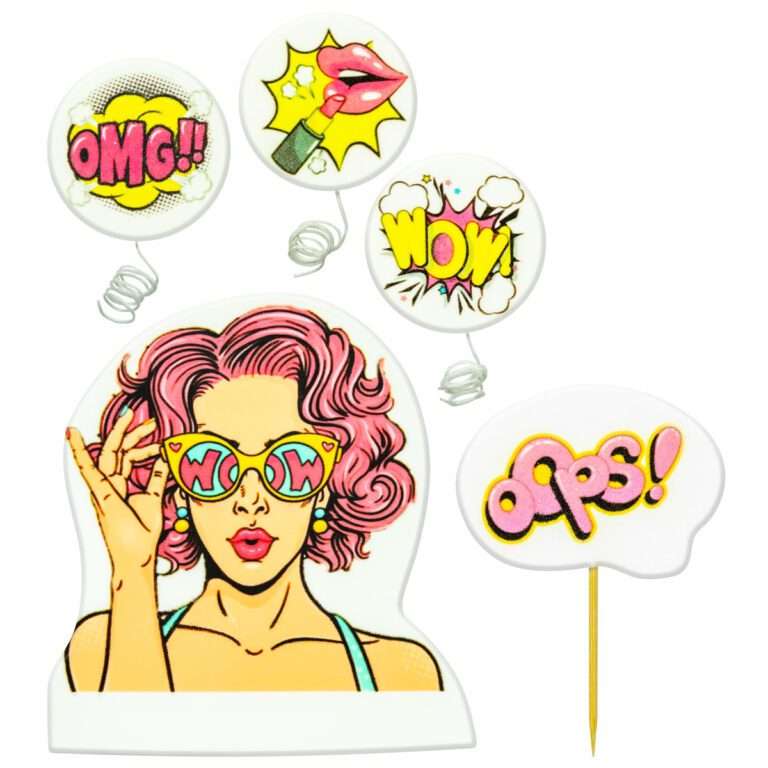 Zestaw: Dziewczyna komiks sprawdzi się jako dodatek na tort urodzinowy dla kobiet i mężczyzn. Można nim ozdobić też inne wypieki ze słodkiego stołu, w tym na przykład babeczki, ciasta i desery.