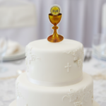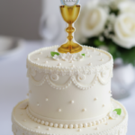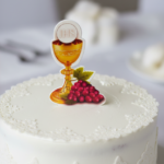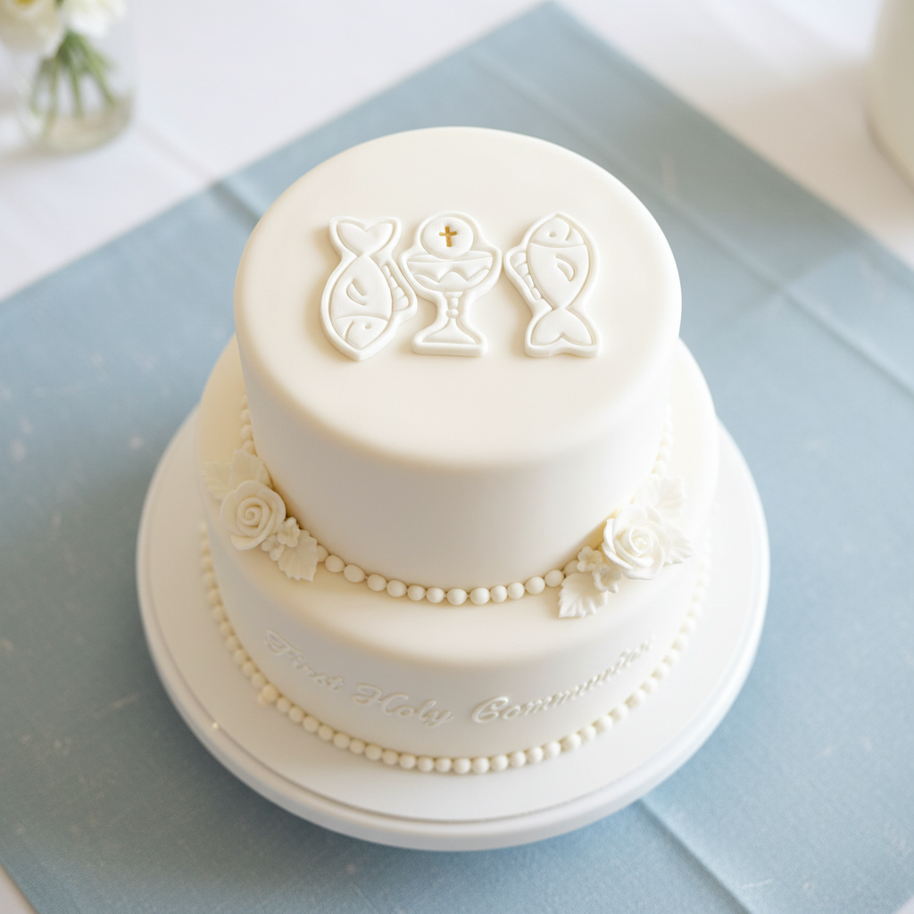 Dekoracja cukrowa „Kielich i dwie ryby” to elegancka ozdoba na tort komunijny, idealna na wyjątkową uroczystość Pierwszej Komunii Świętej. Subtelne detale i staranne wykonanie sprawiają, że dekoracja pięknie prezentuje się na cieście, dodając mu uroczystego i religijnego charakteru. Symbol kielicha i dwóch ryb doskonale podkreśla sakralny wymiar wydarzenia oraz stanowi wyjątkowy akcent na komunijnym stole.