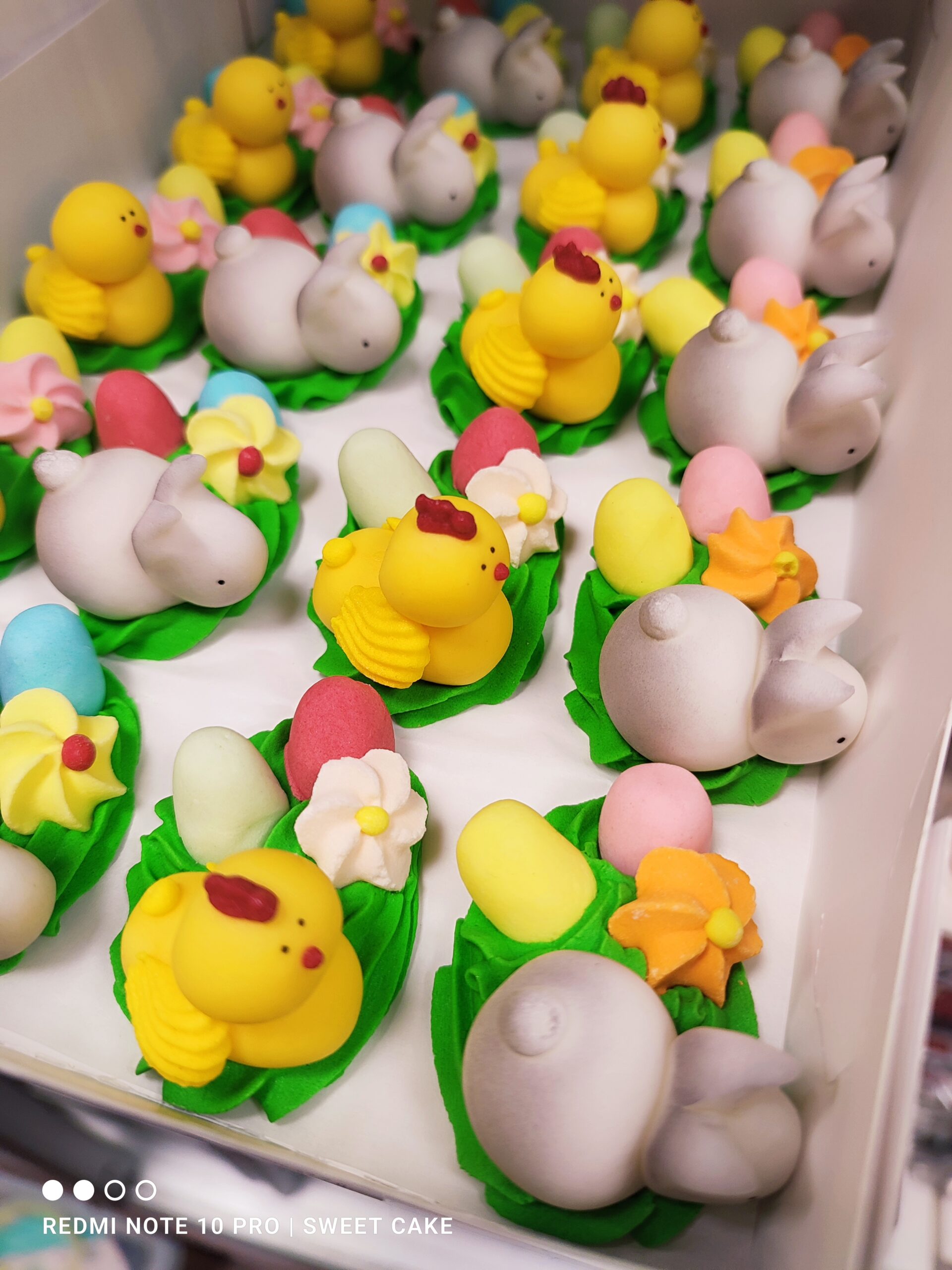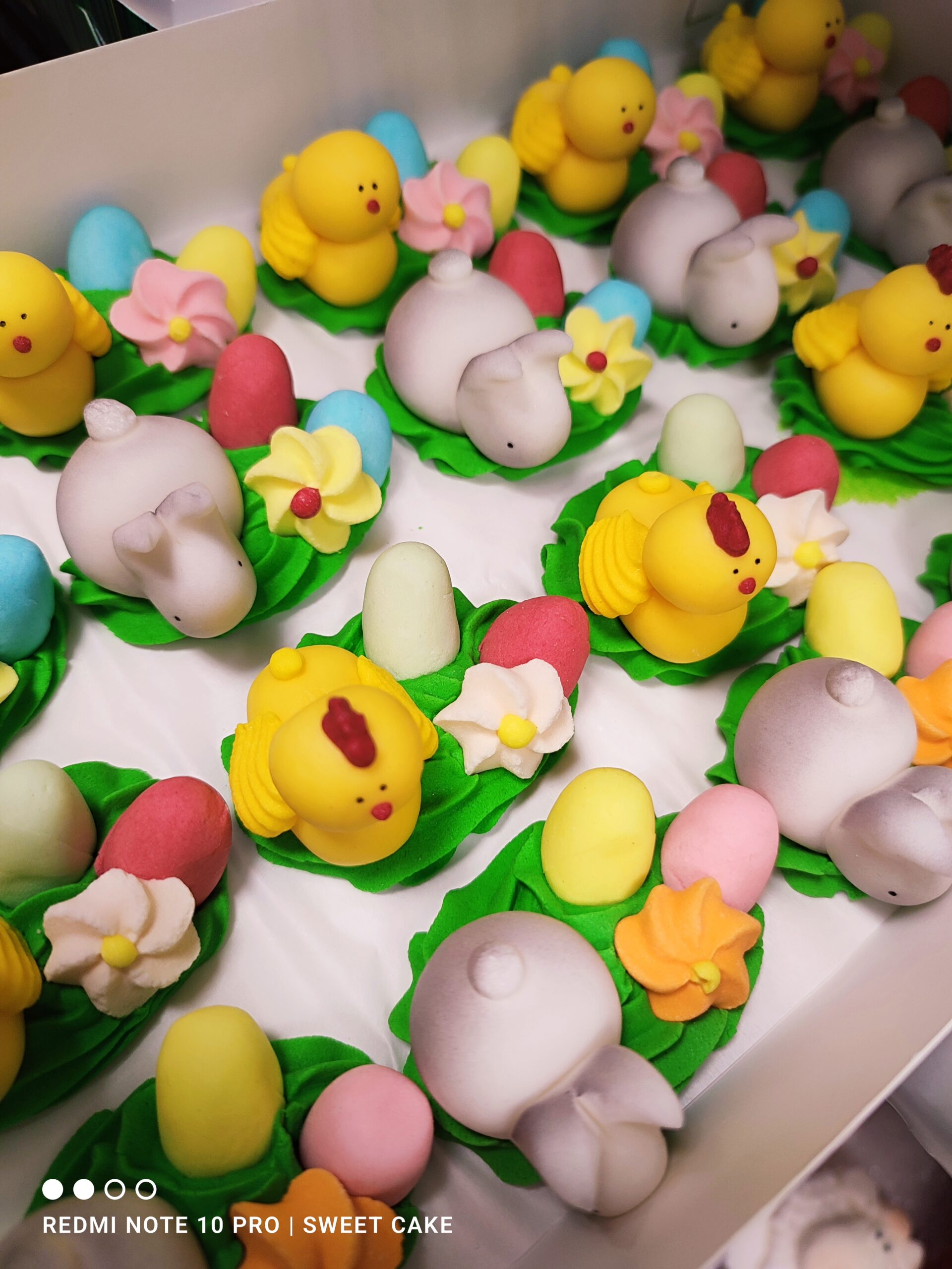 Te ręcznie wykonywane figurki z masy cukrowej mają realistyczne detale: puszyste króliczki w naturalnych pozach, soczystą trawę i barwne jajka w odcieniach pasteli. Produkt jest kruchy, bezglutenowy i nie zawiera E171,o średniej wielkości ok. 4 cm.