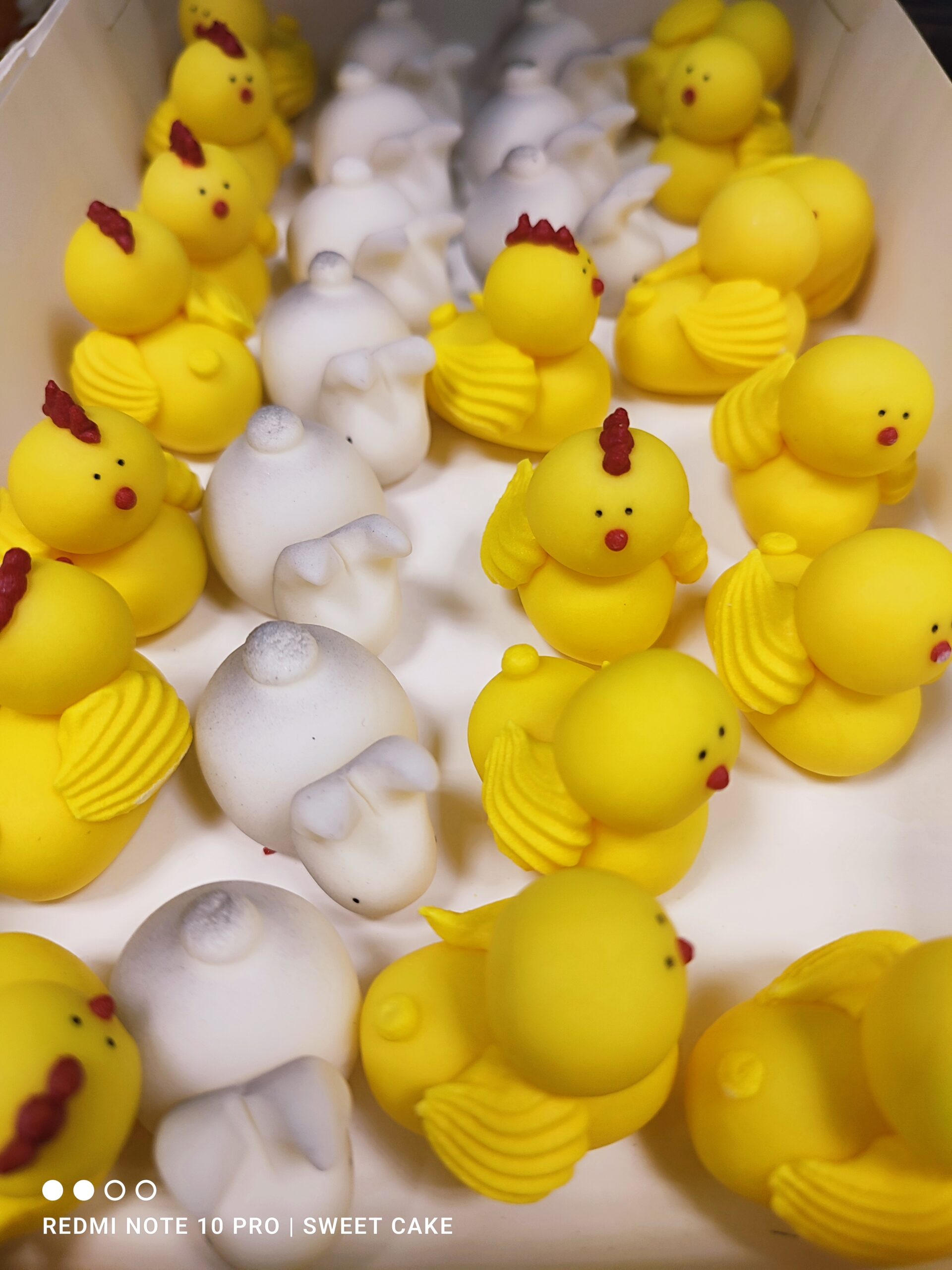 Te dekoracje cukrowe przedstawiają wykluwające się żółte kurczaki w kształcie jajek oraz słodkie króliczki, dodając wypiekom przestrzennego efektu i wiosennego uroku. Każdy element ma około 2 -3 cm wysokości, a zestaw zawiera kilka sztuk w dwóch wzorach, ręcznie formowanych z naturalnymi barwnikami.