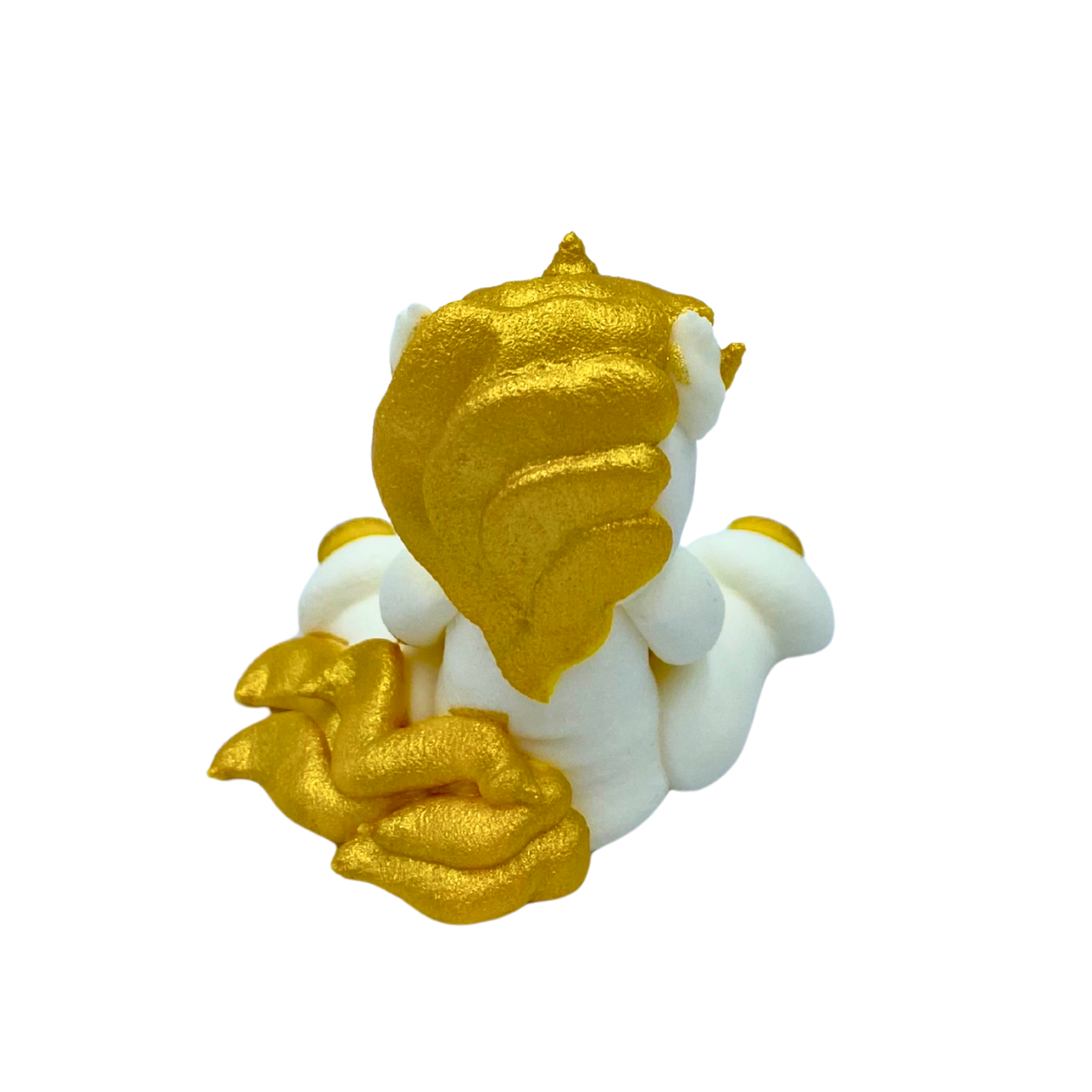 Nasz produkt przedstawia uśmiechniętego, białego jednorożca. Ma on jednak pewną cechę, która go wyróżnia – jego grzywa jest pokryta złotem! Dzięki temu przyciąga uwagę i rozkochuje w sobie zarówno starszych, jak i młodszych. Słodka figurka odnajdzie się świetnie na torcie każdego malucha. W związku z tym, polecamy ją na wiele imprez okolicznościowych m.in. na przyjęcie urodzinowe. Nasze dodatki są tworzona ręcznie, a więc każdy jest całkowicie unikatowy. Co więcej, do ich wykonania posłużyła masa cukrowa. Co to dla Was oznacza? Po zdjęciu jej z tortu możecie z czystym sumieniem ją spałaszować! Z doświadczenia wiemy, że jej słodki smak przyciąga każdego gościa imprezy.