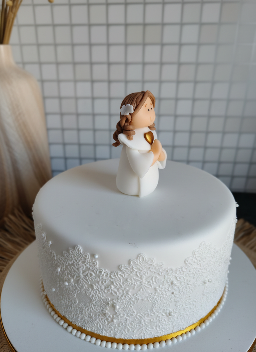 Delikatna figurka cukrowa z dziewczynką w białej sukience komunijnej – idealna ozdoba tortu na Pierwszą Komunię Świętą. Wykonana z najwyższej jakości masy cukrowej, ręcznie malowana z dbałością o detale. Wysokość ok. 8 cm. Produkt Dekorpol – trwały, elegancki i niezawodny wybór na wyjątkowe okazje.