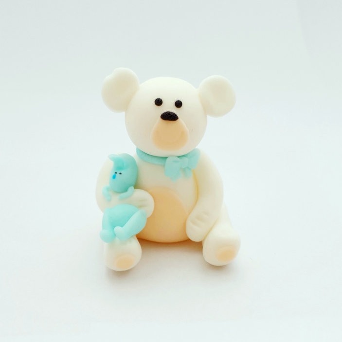 Figurka cukrowa 3D „Miś z niebieskim króliczkiem” to urocza dekoracja na tort, która doda słodkiego uroku każdej uroczystości. Starannie wykonany miś siedzi, tuląc do siebie małego niebieskiego króliczka, tworząc ciepłą i pełną czułości scenkę idealną na dziecięce przyjęcie.