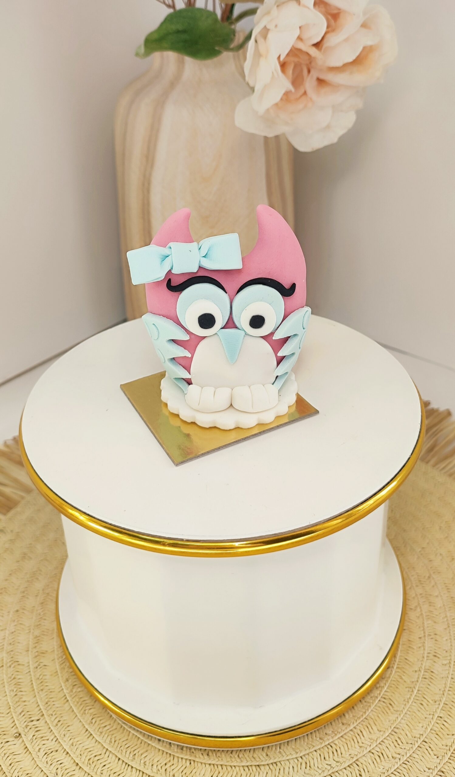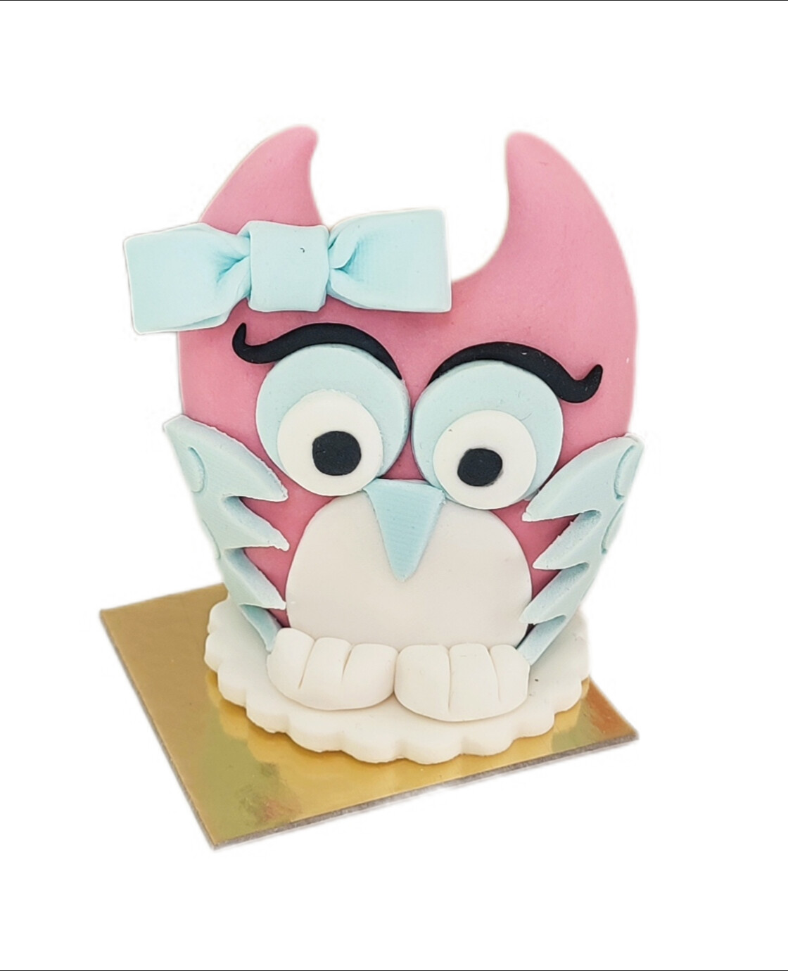 Ta ręcznie wykonana figurka 3D w kształcie dużej różowej sowy to gotowa dekoracja z masy cukrowej, idealna na torty urodzinowe, chrzciny czy przyjęcia dla dzieci. Jej delikatny różowy kolor i sympatyczna mina dodadzą słodyczy każdemu wypiekowi, podkreślając motyw leśny lub bajkowy.