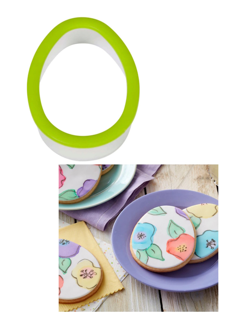 Plastikowa foremka do wykrawania ciastek w kształcie jajka z miękką obwódką. Foremka może służyć do wycinania różnych rodzajów ciastek, do porcjowania ciasta, do wycinania kanapek.
