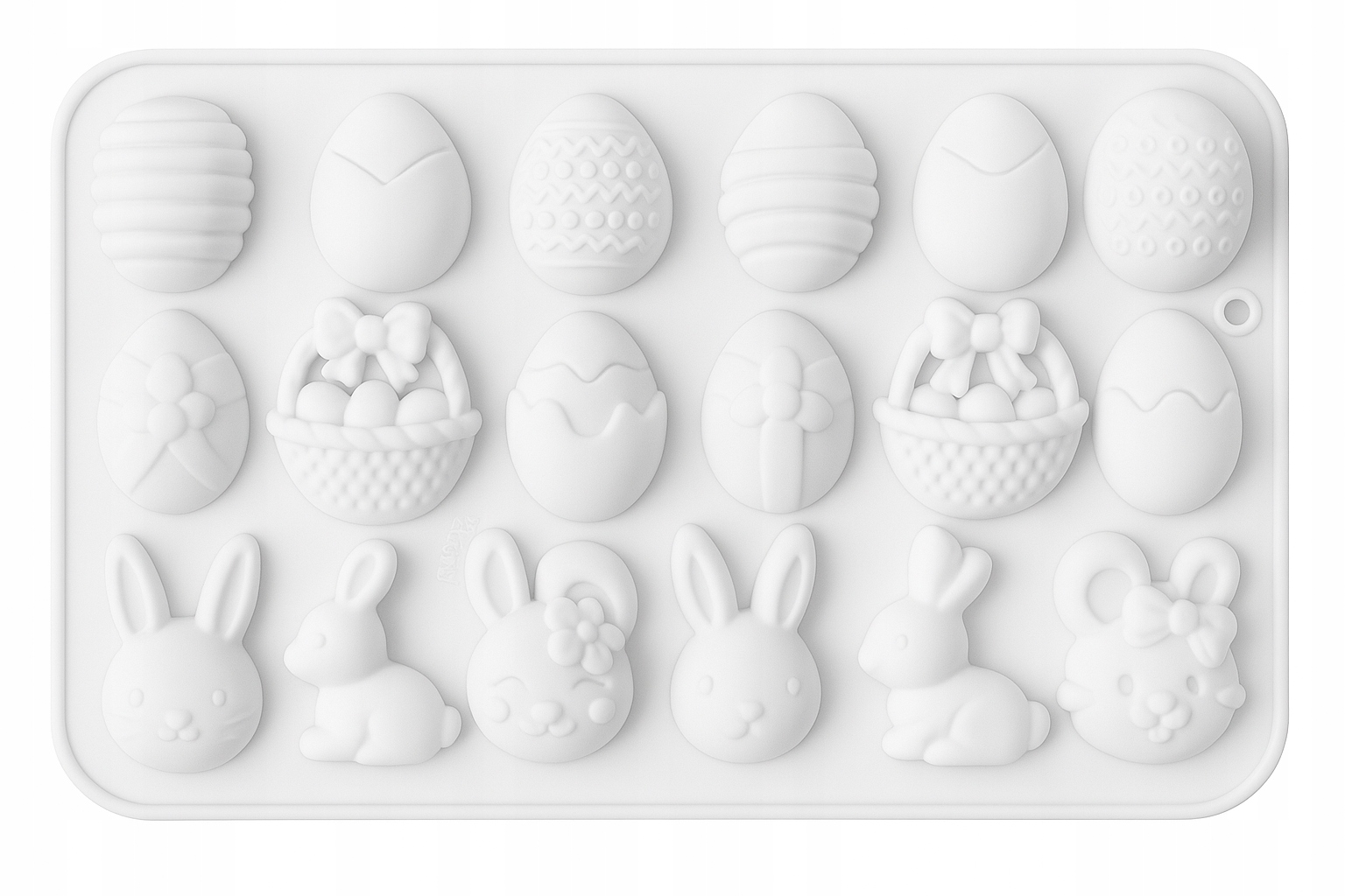 Foremka silikonowa do czekoladek – Wielkanoc to praktyczne i wszechstronne narzędzie, które pozwoli Ci stworzyć wyjątkowe, świąteczne słodkości w kształtach nawiązujących do Wielkanocy, takich jak pisanki, zajączki i kurczaczki. Wykonana z wysokiej jakości silikonu, jest elastyczna, nieprzywierająca i łatwa w czyszczeniu, co ułatwia wyjmowanie gotowych czekoladek oraz pralinek. Foremka jest odporna na temperatury od -40°C do +220°C, dzięki czemu można ją używać zarówno w lodówce, jak i w piekarniku czy mikrofalówce. Można ją także myć w zmywarce, co zapewnia wygodę użytkowania. W jednej foremce przygotujesz kilkanaście czekoladek o wymiarach około 3-5 cm, idealnych do dekoracji stołu wielkanocnego lub jako smaczny upominek dla bliskich. Produkt doskonale sprawdzi się również do tworzenia galaretek, pralinek, kostek lodu czy dekoracji z masy cukrowej i marcepanowej, co czyni go uniwersalnym akcesorium w Twojej kuchni