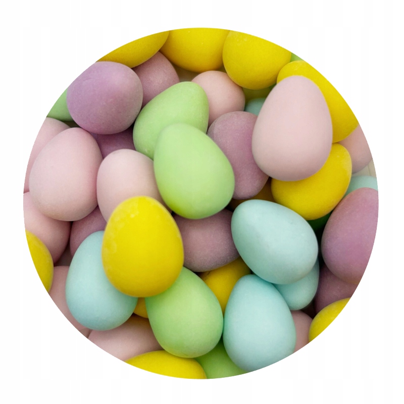 Małe jajeczko czekoladowe w mieszance kolorów (pastelowe barwy jak róż, błękit, żółć) waży około 2-4 g na sztukę i mierzy ok. 1,5 cm wysokości. Wypełnione mleczną lub orzechową czekoladą z chrupiącą cukrową skorupką, świetnie nadaje się do mazurków, babeczek czy deserów.