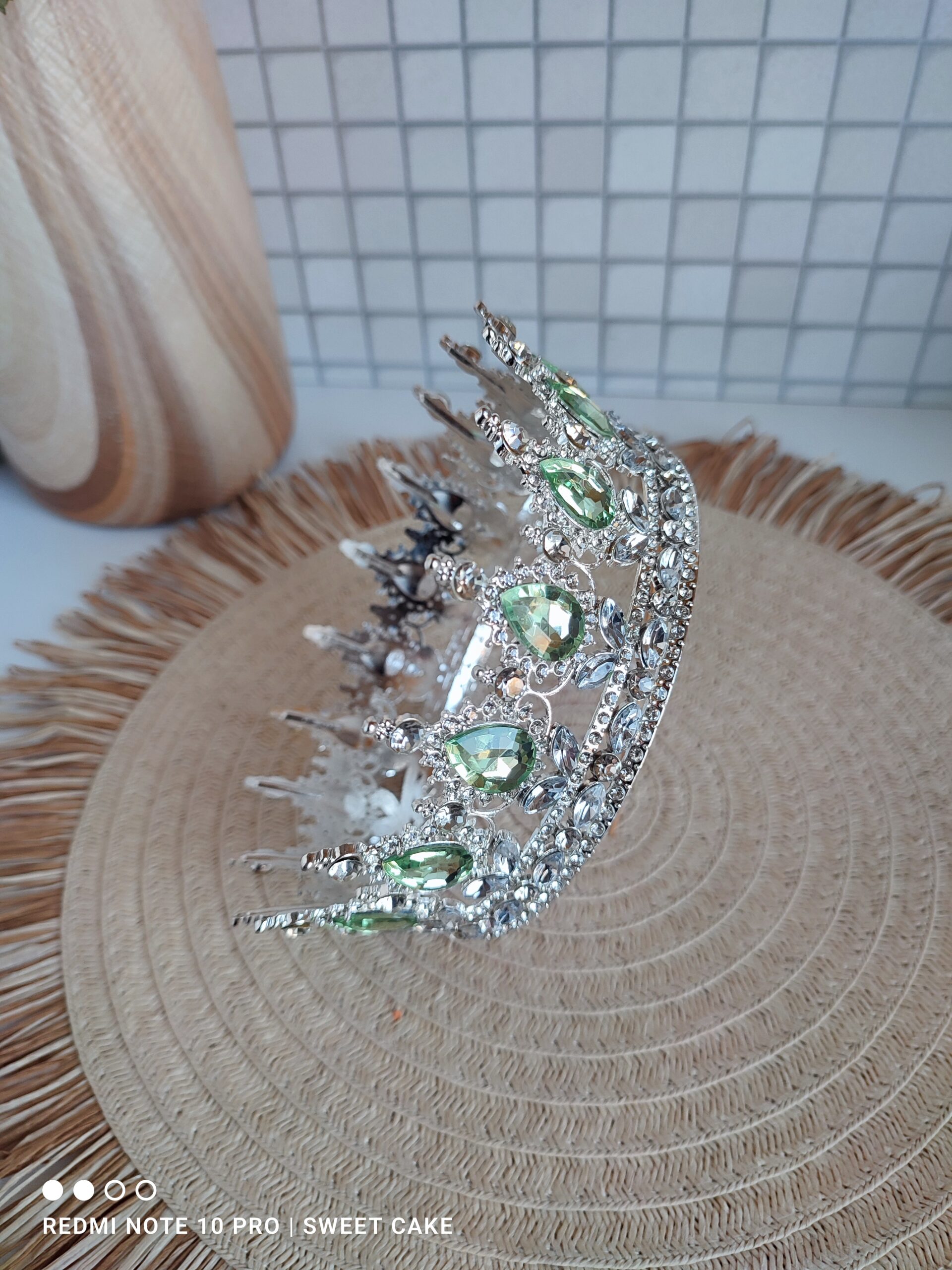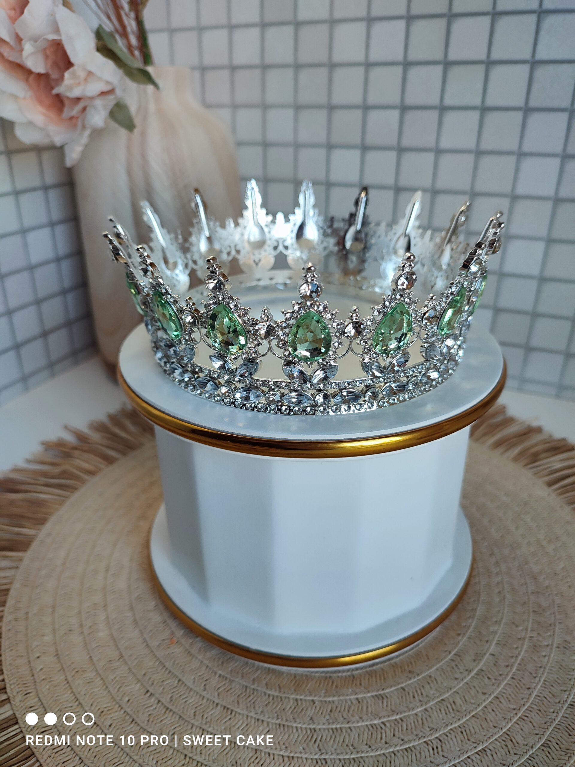 Korona srebrna z jasnozielonym KAMIENIEM 13 cm