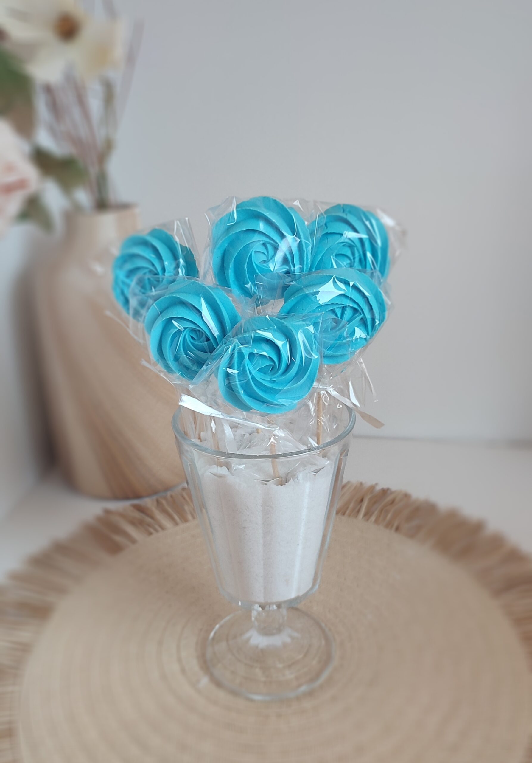 Lizaki bezowe na patyku w pięknym Niebieskie kolorze to idealna dekoracja do tortów i deserów. Delikatne, chrupiące bezy o słodkim smaku, uformowane w kształt lizaka, dodają uroku każdemu wypiekowi. Doskonale sprawdzą się na przyjęciach, urodzinach czy baby shower, wprowadzając wyjątkową, elegancką i kolorową ozdobę. Każdy lizak jest starannie wykonany, by zachwycać wyglądem i smakiem. Produkt pakowany pojedynczo, co pozwala na łatwe dopasowanie do różnych potrzeb dekoracyjnych.