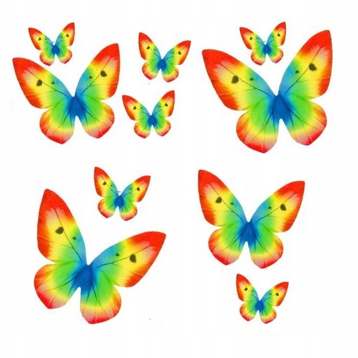 Motyle waflowe drukowane Tęczowy – zestaw 10 sztuk to kolorowa dekoracja, która ozdobi każdy tort, nadając mu wyjątkowy i radosny charakter. Wykonane z lekkiego, waflowego materiału, motyle mają piękne, wielobarwne nadruki w odcieniach tęczy, które przyciągają wzrok i dodają słodkości każdej wypieku.