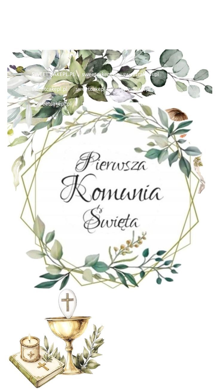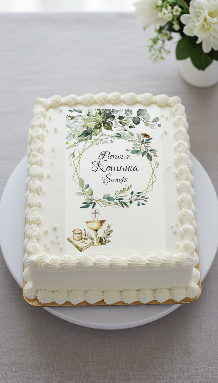 OPŁATEK na tort KOMUNIJNY wzór N13 pierw kom. święta w liściastym wianku A4