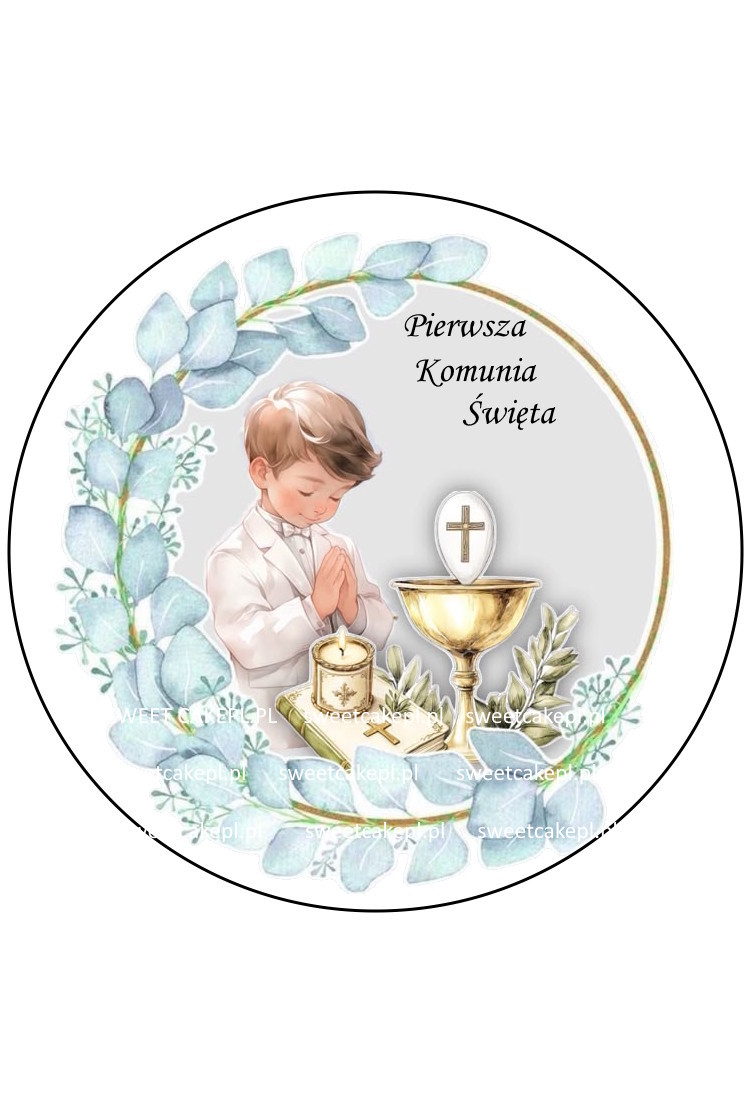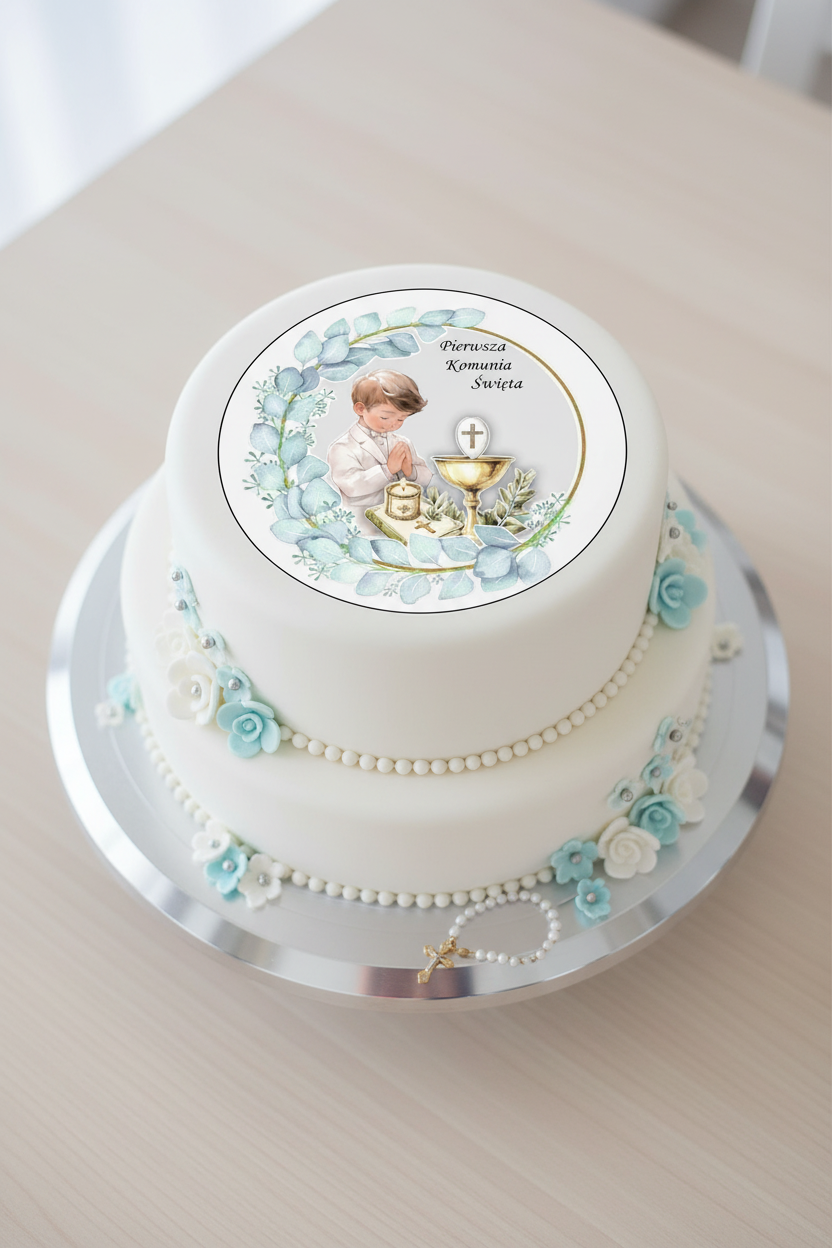 OPŁATEK waflowy na tort KOMUNIJNY wzór N18 Chłopic w liściastym niebieskim wianku