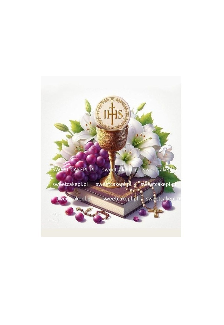 OPŁATEK na tort KOMUNIJNY wzór N35 kielich na książce z liliami w wersii małej