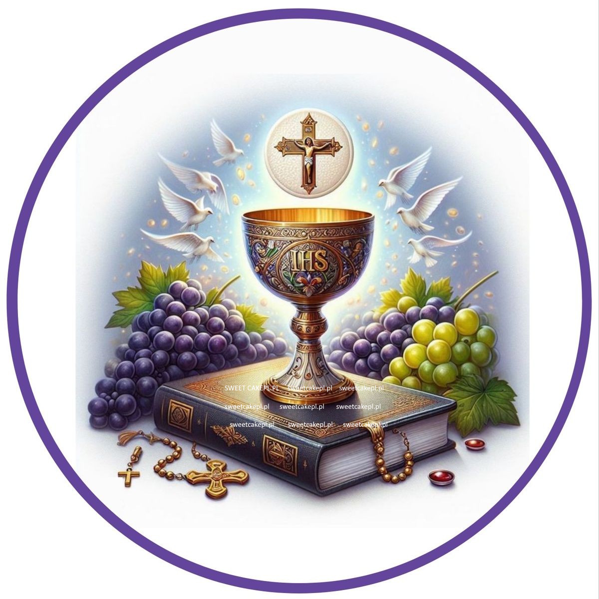 OPŁATEK na tort KOMUNIJNY wzór N37 okragły kielich na książce niebieski