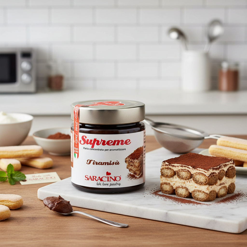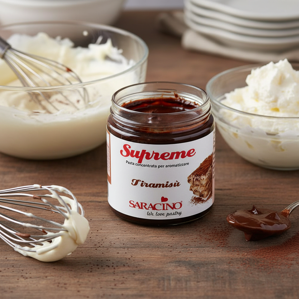 Pasta smakowa Koncentrat TIRAMISU Saracino 200g to wysoko skoncentrowany aromat w kremie o intensywnym smaku, idealny do wzbogacania kremów, ciast i deserów. Produkt marki Saracino zapewnia stabilny smak i łatwość użycia w profesjonalnej cukierni.