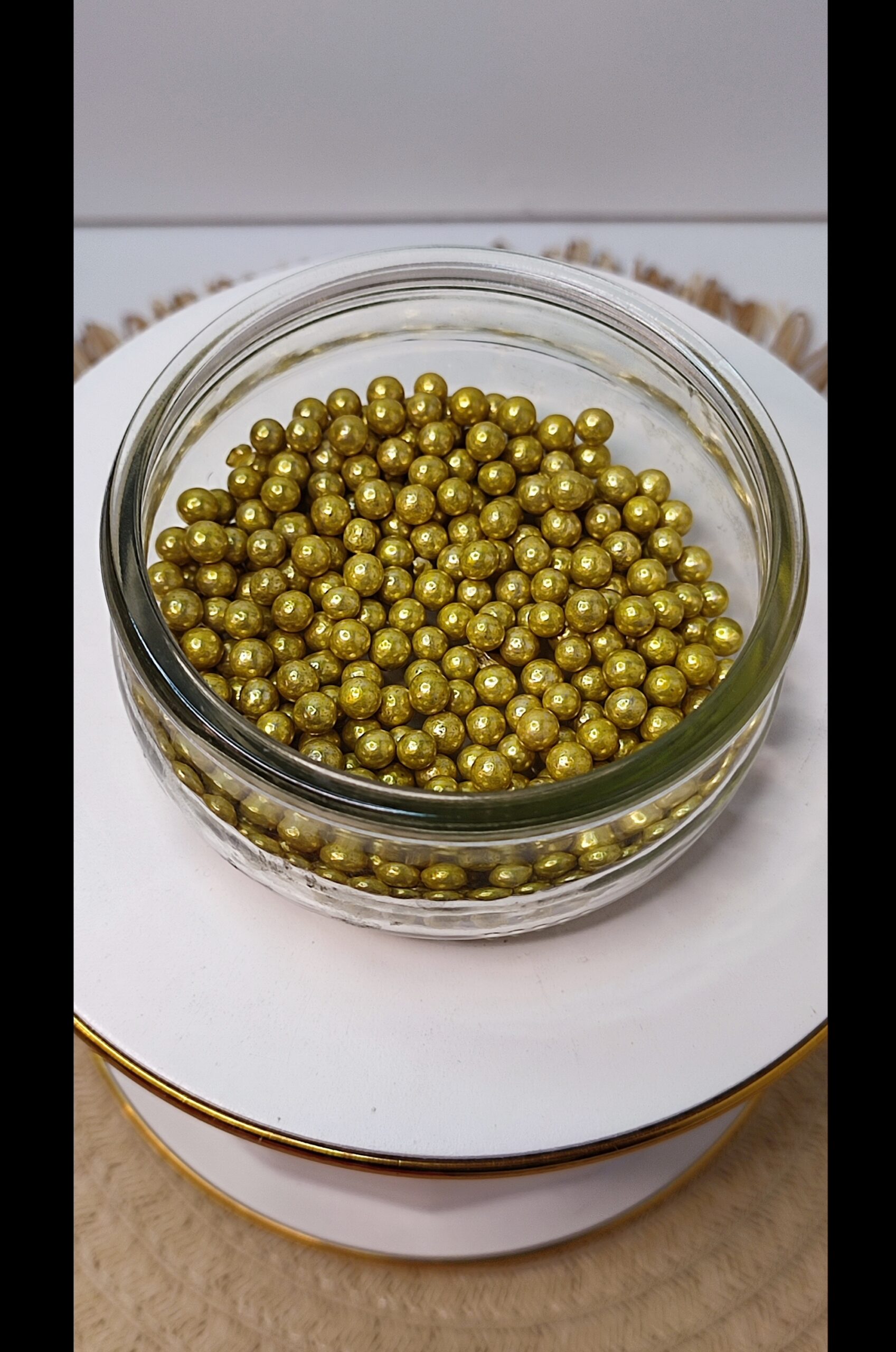 Perełki cukrowe 6 mm ZŁOTE błyszczące 50 g to elegancka dekoracja cukiernicza, która doda luksusu Twoim wypiekom. Intensywny złoty połysk sprawia, że idealnie pasują do tortów weselnych, świątecznych ciast czy wykwintnych deserów, podkreślając ich wyjątkowy charakter.
