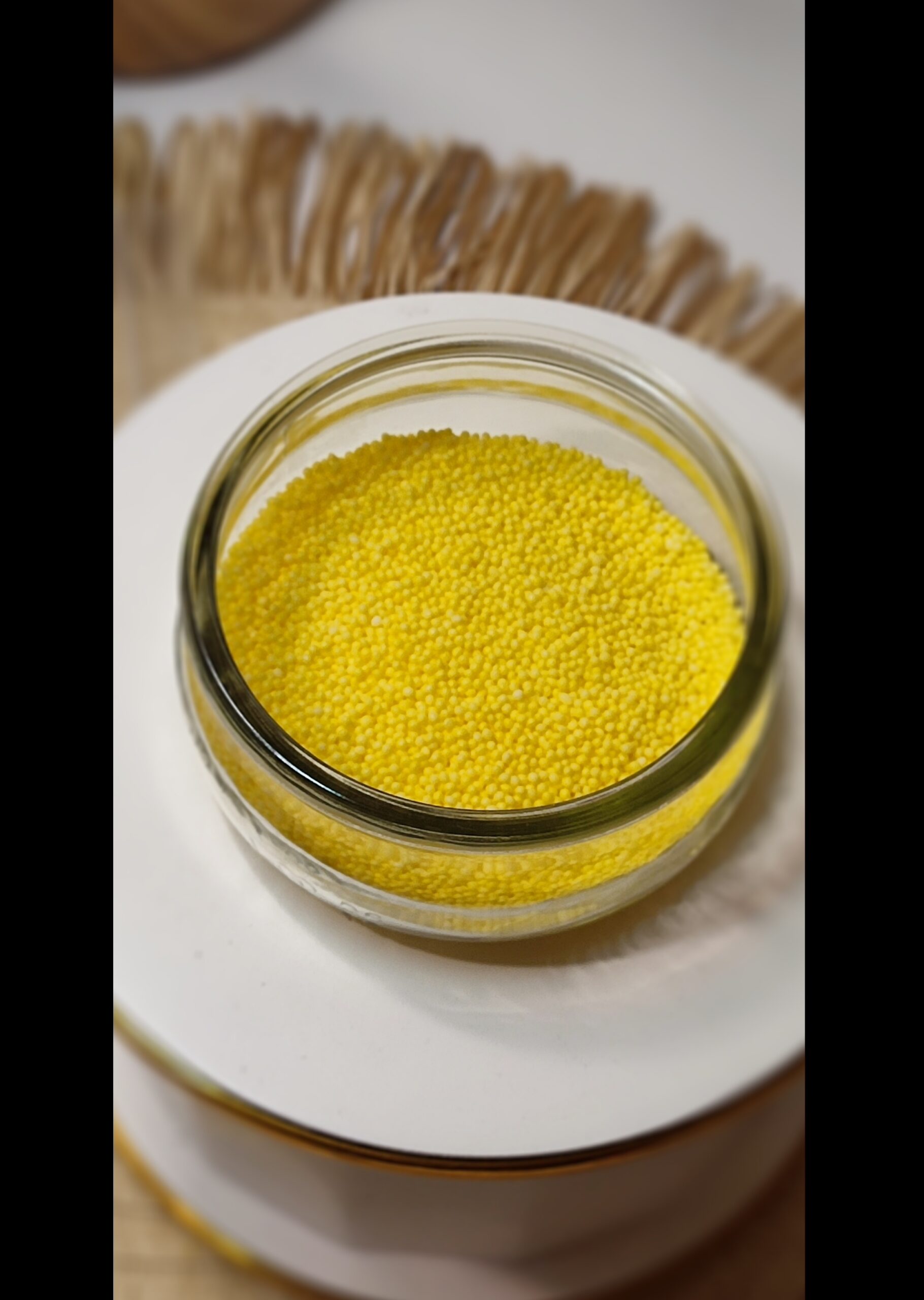 Posypka Cukrowa Maczek Żółty (979M) 50g to drobna, jadalna dekoracja cukiernicza o intensywnym żółtym kolorze, idealna do wzbogacenia smaku i wyglądu wypieków. Produkt składa się z maleńkich kuleczek o średnicy około 1 mm, które łatwo przylegają do powierzchni ciast i deserów.