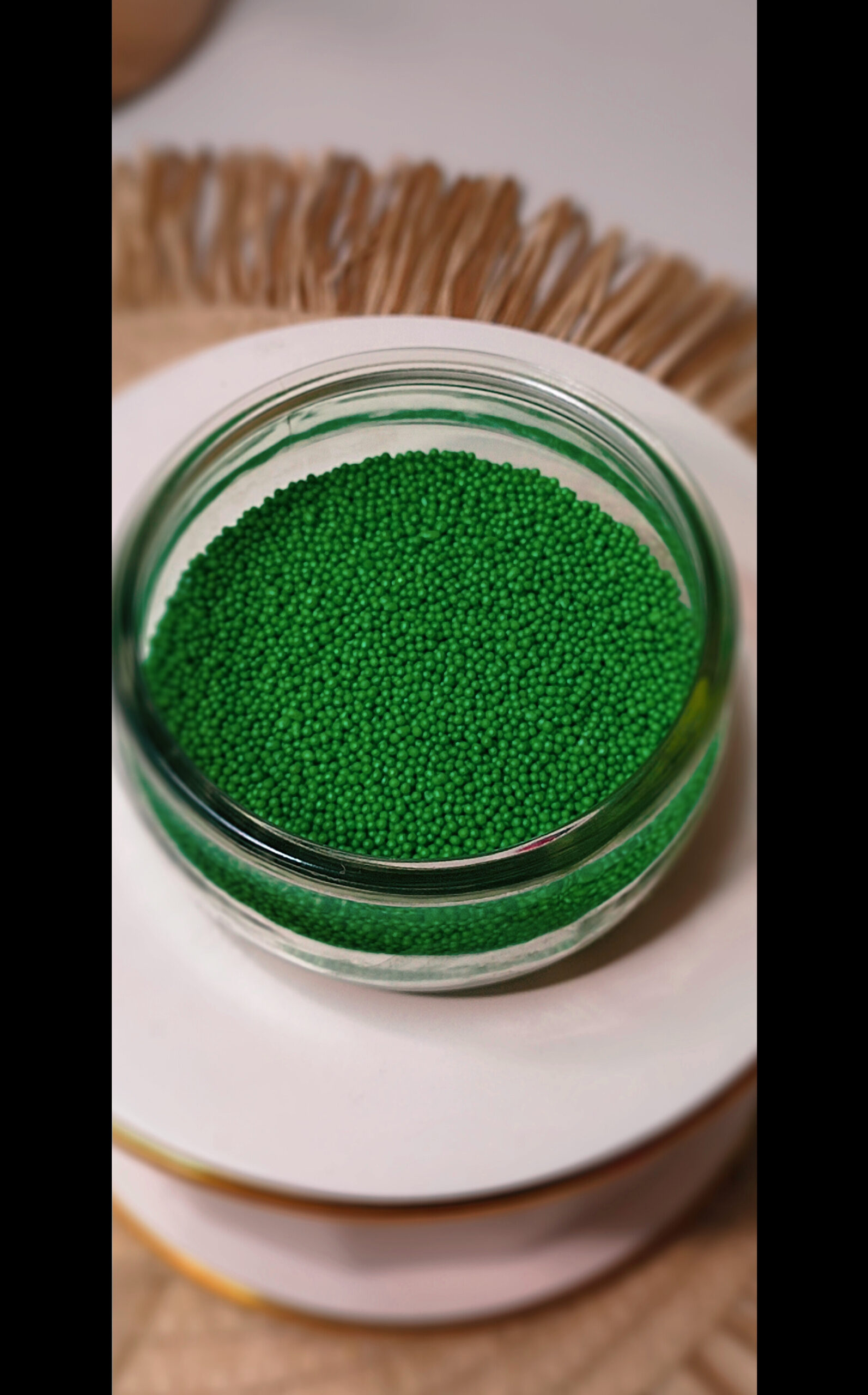 Użyj jej do ozdabiania tortów weselnych, świątecznych deserów czy muffinek, gdzie ciemnozielony odcień pięknie kontrastuje z białymi kremami lub jasnymi polewami. Posypka jest jadalna i łatwa w aplikacji – wystarczy posypać bezpośrednio na powierzchnię