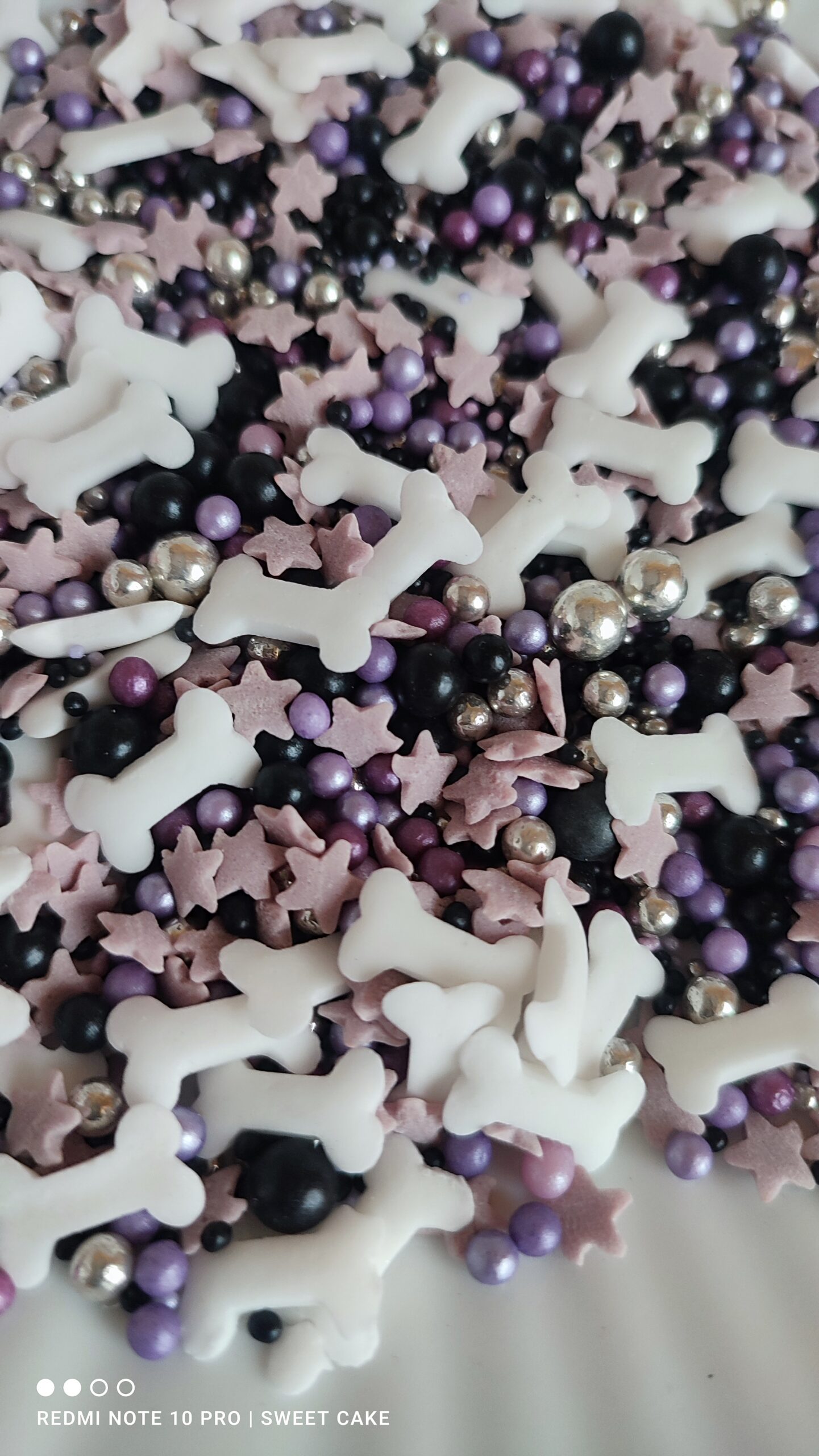 Dekoracyjna posypka cukrowa w kształcie kolorowych kości (50g) – idealna do tortów i wypieków z motywem Psi Patrol! Ta mieszanka białych, czarnych i wielobarwnych kosteczek doda Twojemu ciastu szczeniackiego uroku. Rozsyp na kremie, posyp babeczki lub użyj jako topping do muffinek – perfekt dla urodzinowych imprez.