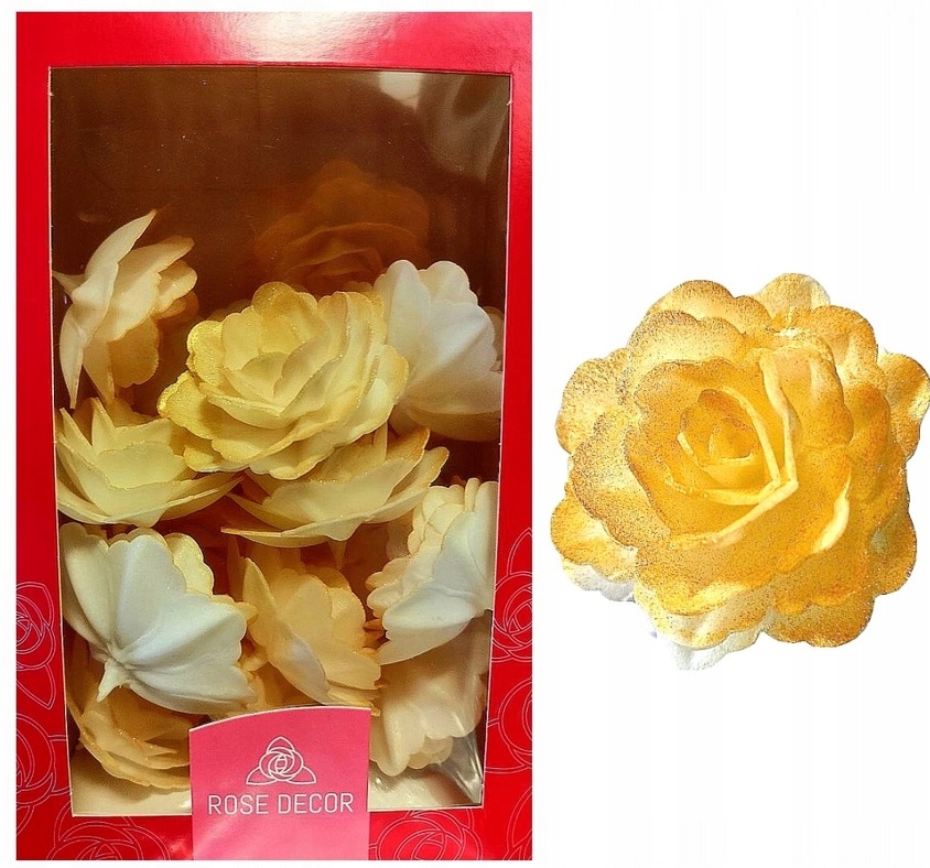 Dodaj wyjątkowego blasku swoim wypiekom dzięki złotej róży chińskiej o średnicy 7 cm! Ta delikatna, opłatkowa ozdoba od Rose Decor to elegancki i subtelny akcent idealny do dekoracji tortów, ciast oraz deserów na różne okazje – od urodzin, przez wesela, aż po wyjątkowe przyjęcia.
