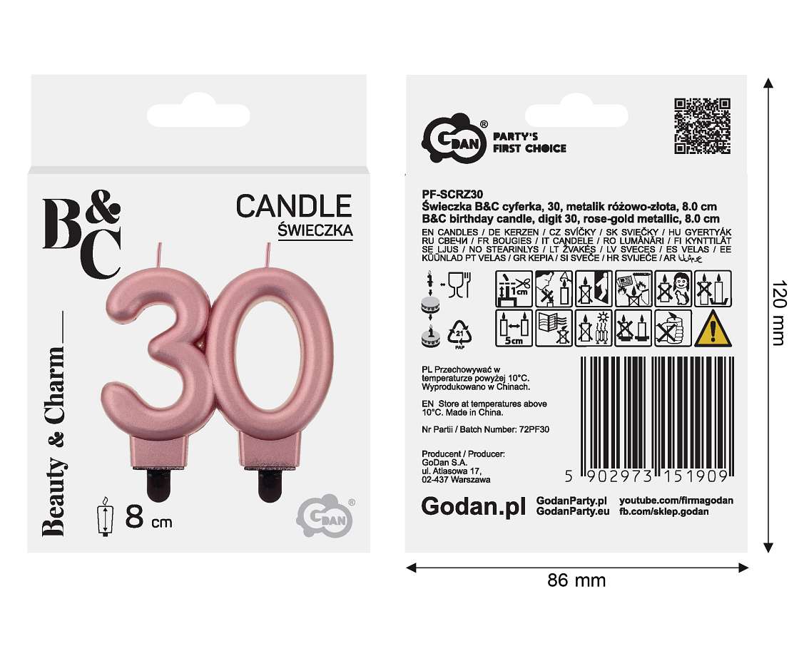 Różowo-złota świeczka na tort 30, na trzydzieste urodziny rozpali urodzinowe emocje i zachwyci gości. Świeczka na tort w kształcie cyfry 30 to piękna i elegancka ozdoba tortowa, na którą zasługujesz Ty oraz Twoi bliscy. Wygodne podstawki pozwolą Ci łatwo i wygodnie zamocować świeczkę na torcie lub w urodzinowym cieście. Dzięki nim świeczka cyfra 30 będzie także stabilnie stać i czekać na zdmuchnięcie przez solenizanta/solenizantkę. Świeczka na tort w kształcie liczby 30 rosegold okaże się również niezastąpiona, jeśli szykujesz imprezę firmową, jubileusz lub rocznicę ślubu.