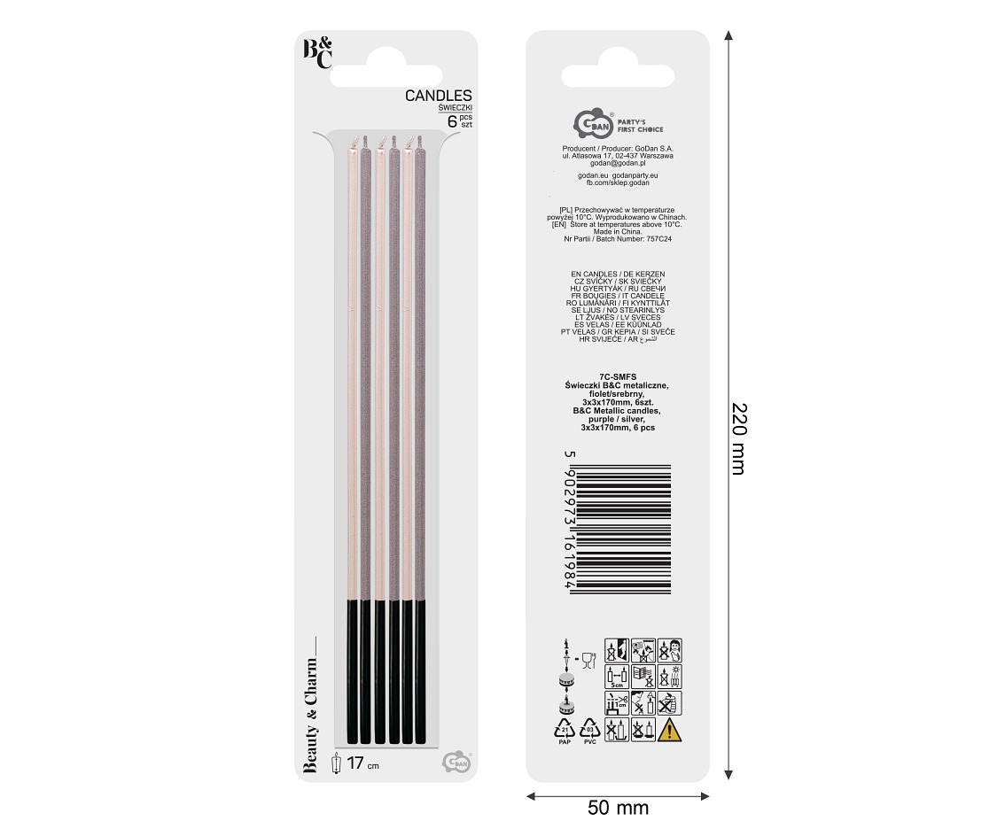 ŚWIECZKA urodzinowa B&C metaliczne, fiolet/srebrny, 3x3x170mm, 6 szt.