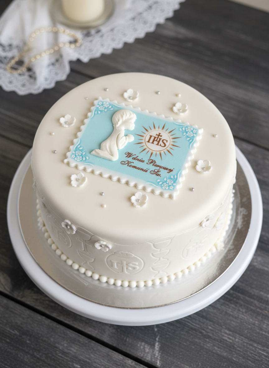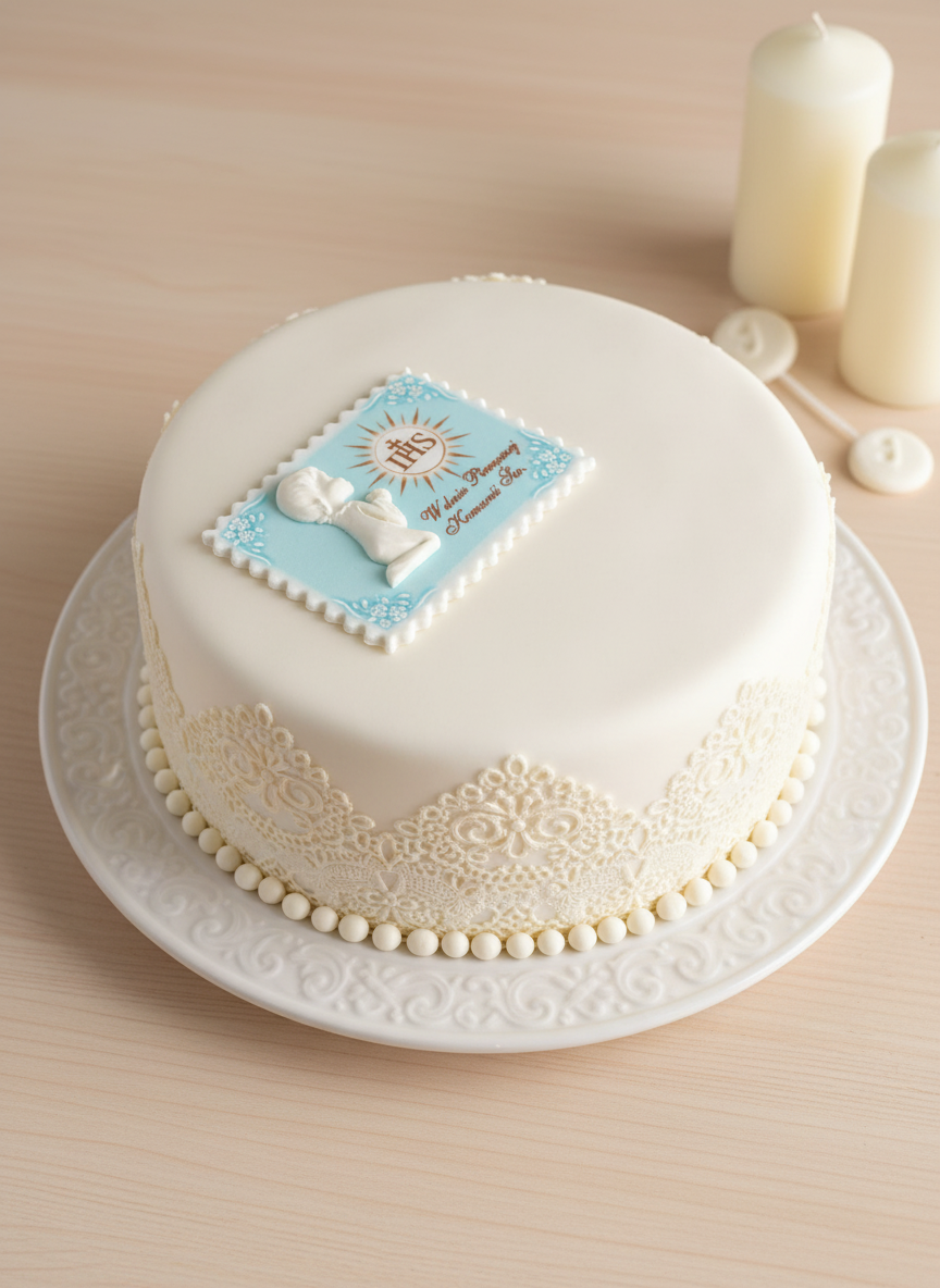 Piękna, personalizowana tabliczka cukrowa w niebieskim odcieniu idealnie pasująca do Pierwszej Komunii Świętej chłopca. Model 083 zachwyca delikatnym wzorem z motywami religijnymi, hostią i subtelnymi akcentami w bieli i złocie. Wykonana z najwyższej jakości cukru, o wymiarach ok. 10×15 cm, gotowa do umieszczenia na torcie lub pannie młodej. Dodaj imię dziecka i datę Komunii – sprawisz, że ten dzień będzie niezapomniany! Jedna sztuka w eleganckim opakowaniu.