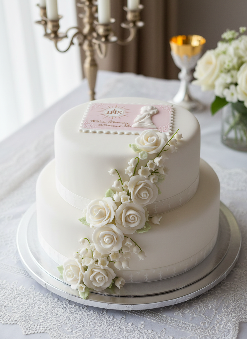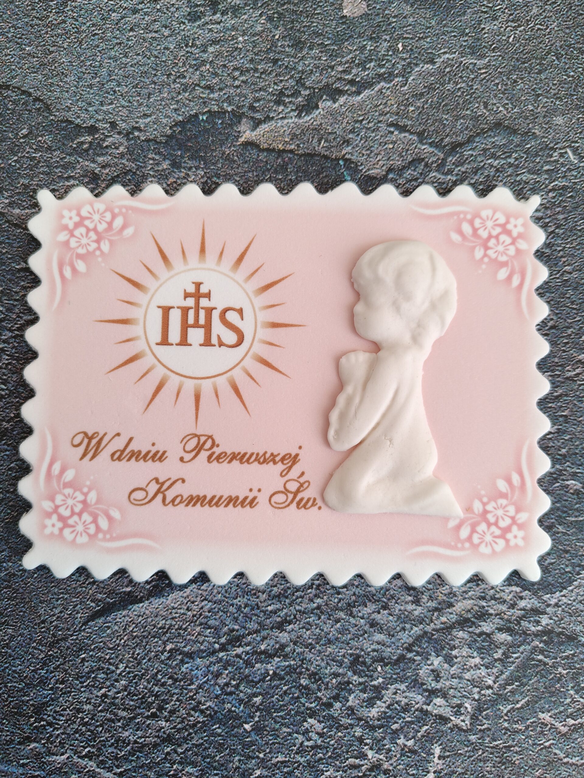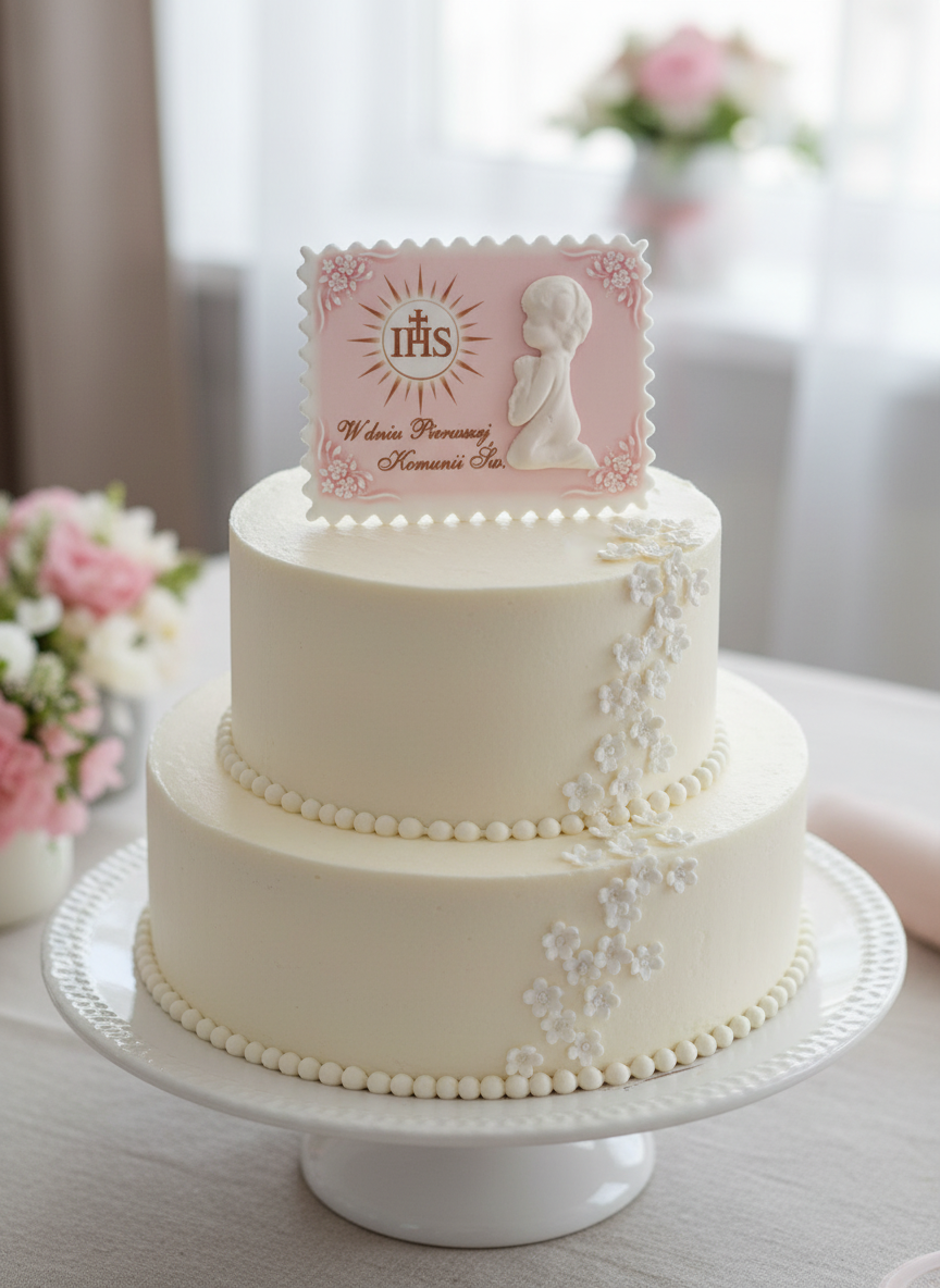 Piękna, personalizowana tabliczka cukrowa w różowym odcieniu idealnie pasująca do Pierwszej Komunii Świętej dziewczynki. Model 083 zachwyca delikatnym wzorem z motywami religijnymi, hostią i subtelnymi akcentami w bieli i złocie. Wykonana z najwyższej jakości cukru, o wymiarach ok. 10×15 cm, gotowa do umieszczenia na torcie lub pannie młodej. Dodaj imię dziecka i datę Komunii – sprawisz, że ten dzień będzie niezapomniany! Jedna sztuka w eleganckim opakowaniu.