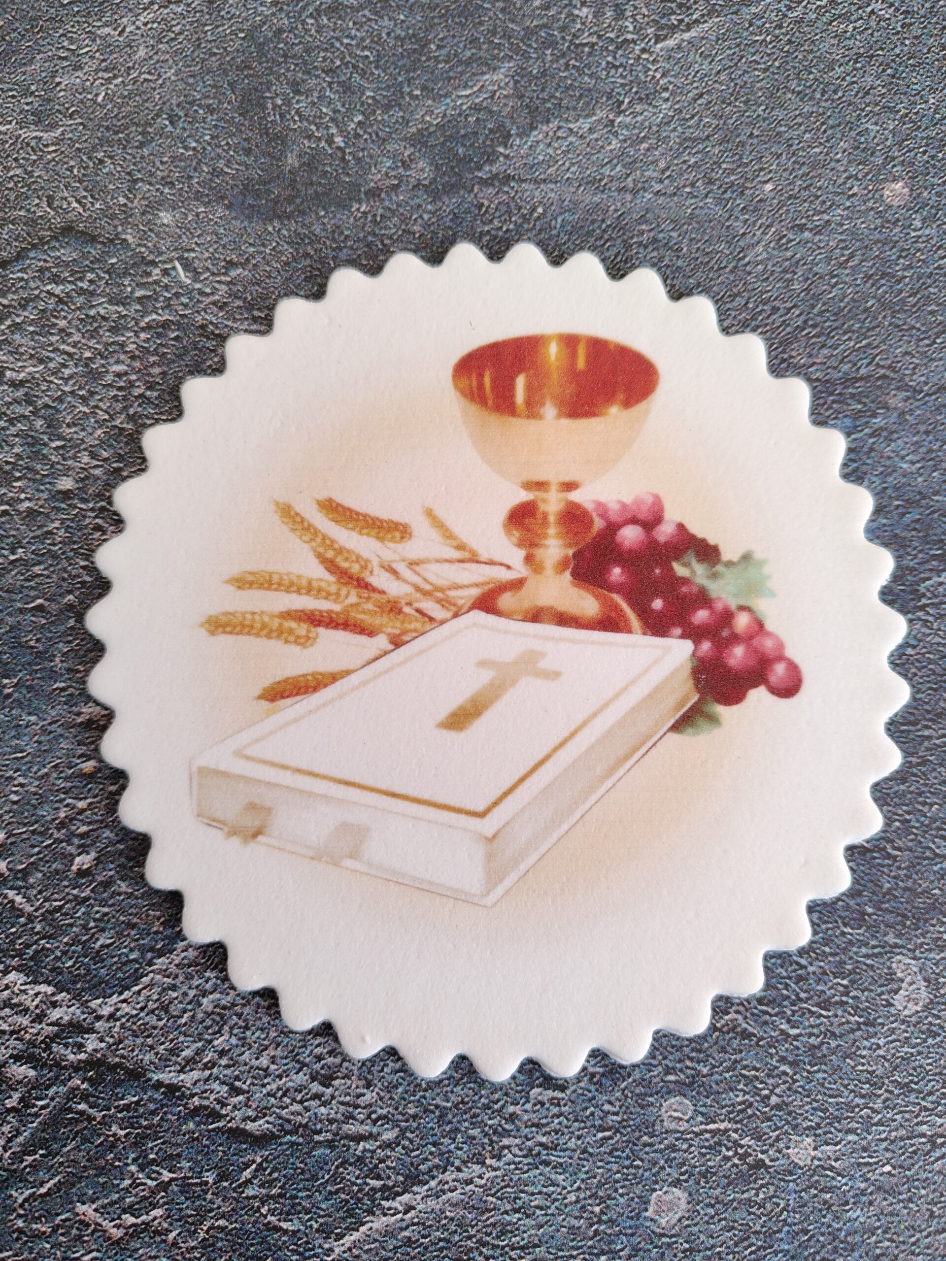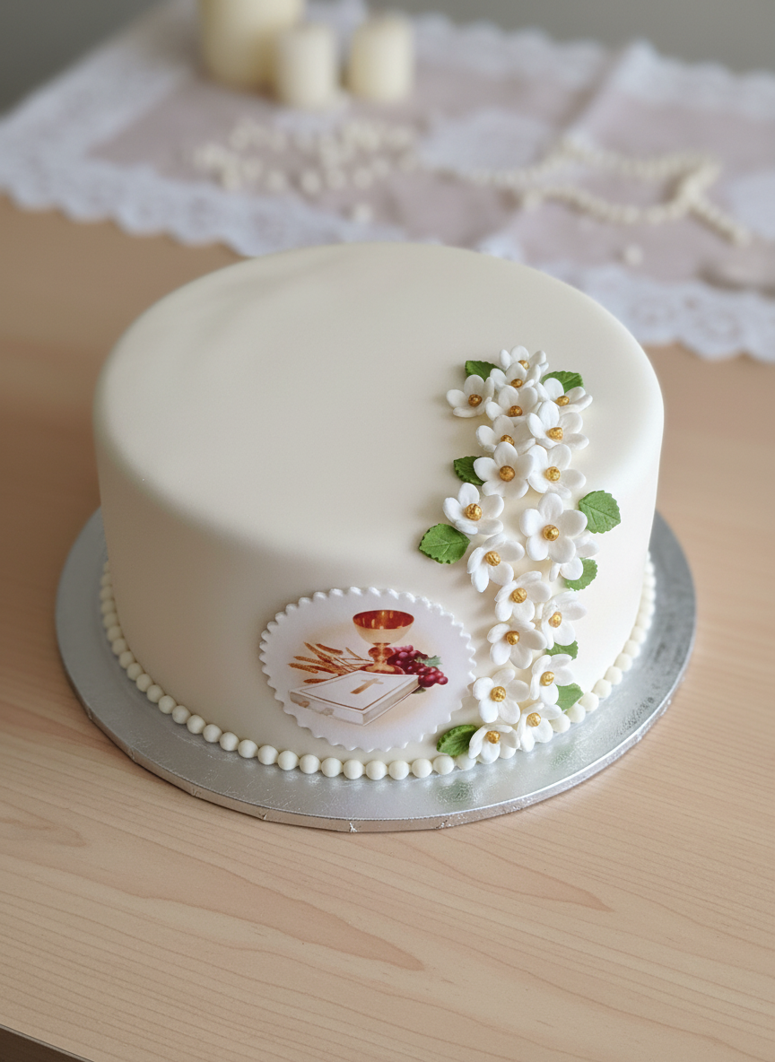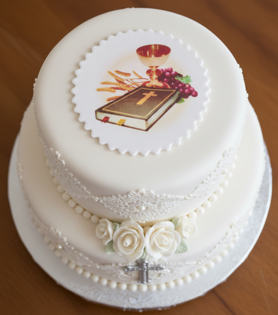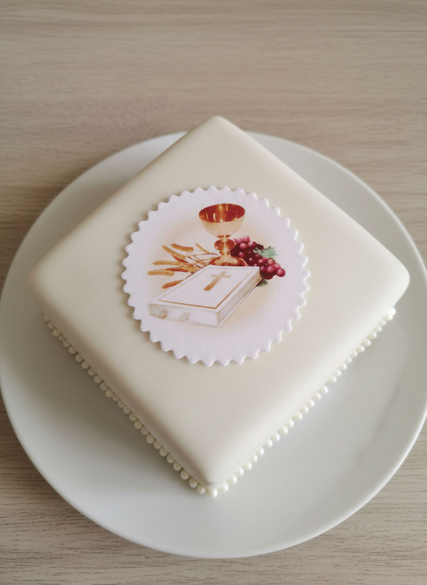 Elegancka tabliczka cukrowa o wymiarach idealnych na tort komunijny (ok.10 cm). Zdobiona subtelnym nadrukiem Komunijna 083/D – delikatny wzór z motywami religijnymi, białym tłem i złotymi akcentami, który doda tortowi wyjątkowego charakteru. Wykonana z najwyższej jakości jadalnego cukru. Łatwa w aplikacji – wystarczy delikatnie ułożyć na kremie. Idealna na Pierwszą Komunię Świętą!