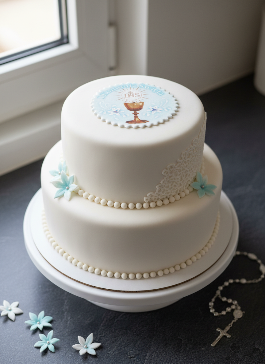 Delikatna tabliczka z masy cukrowej o smaku waniliowym, ozdobiona eleganckim nadrukiem komunijnym – krzyżem, hostią i napisem „Pierwsza Komunia Święta”. Idealny, symboliczny upominek dla dziecka na ten wyjątkowy dzień. Wymiary: 10 cm, w estetycznym opakowaniu prezentowym, ręcznie dekorowana. Smakuje bosko!
