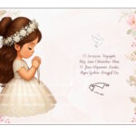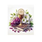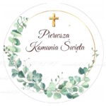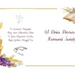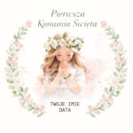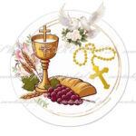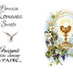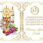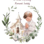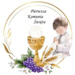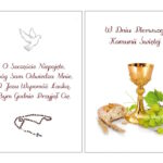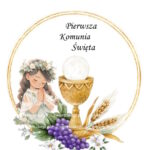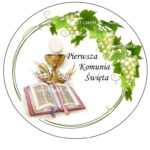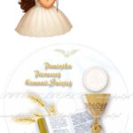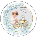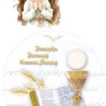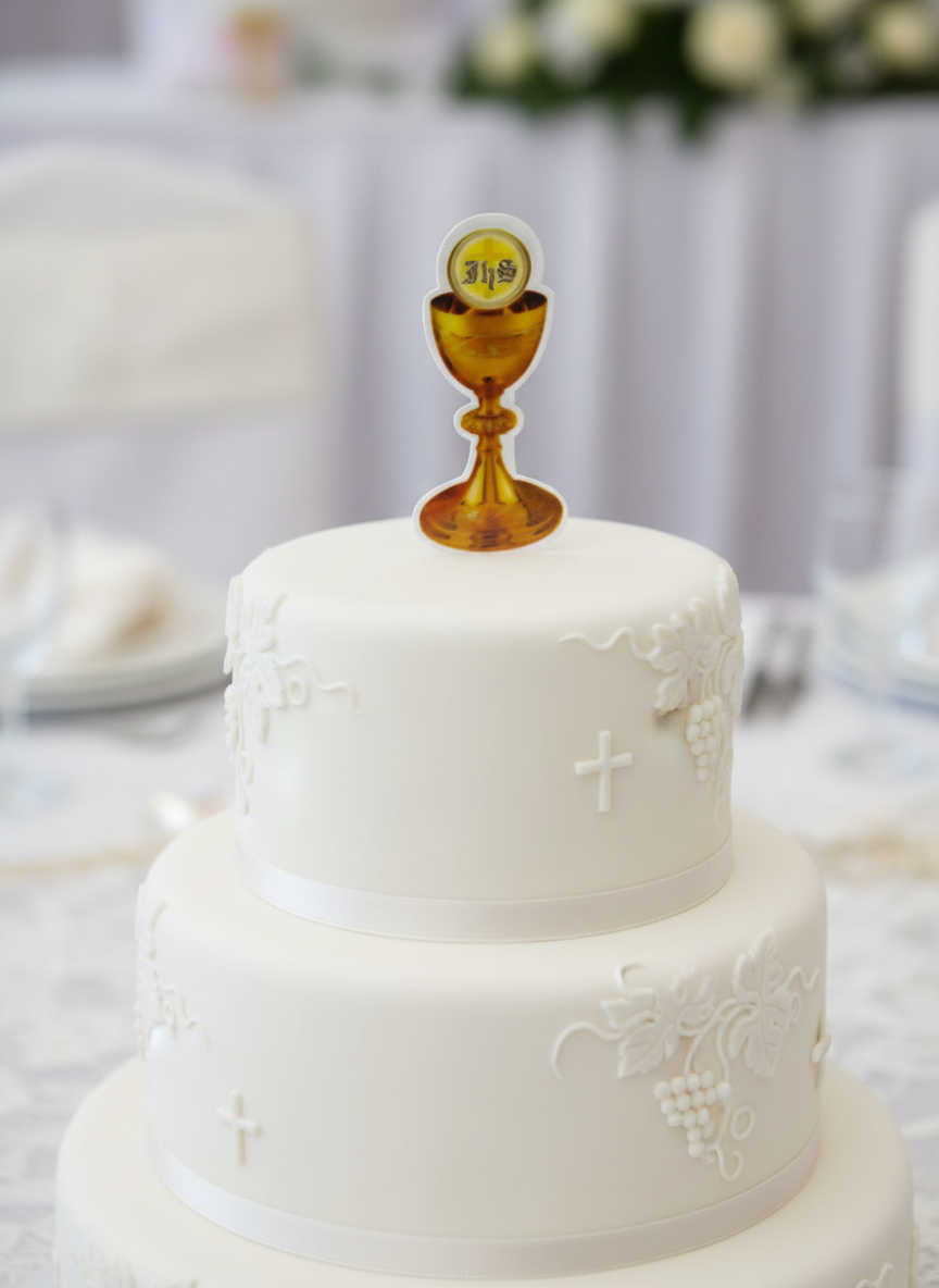 Topper prezentuje klasyczny komunijny kielich ze skrzydełkami i hostią umieszczoną w środku, często z delikatnymi promieniami, liśćmi lub koronką wokół, co podkreśla uroczysty i religijny charakter Pierwszej Komunii Świętej. Wzór jest dwuwymiarowy, dobrze widoczny z każdej strony tortu, a jego biały lub złocisty kolor idealnie pasuje do klasycznej, eleganckiej dekoracji ciasta.