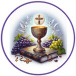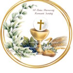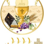TOPPER CUKROWY „Kielich komunijny – wzór 4” to elegancka, jednostronna dekoracja na tort wykonywana z białego masy marcepanowej lub cukru, w kształcie kielicha z hostią i motywem komunijnym.