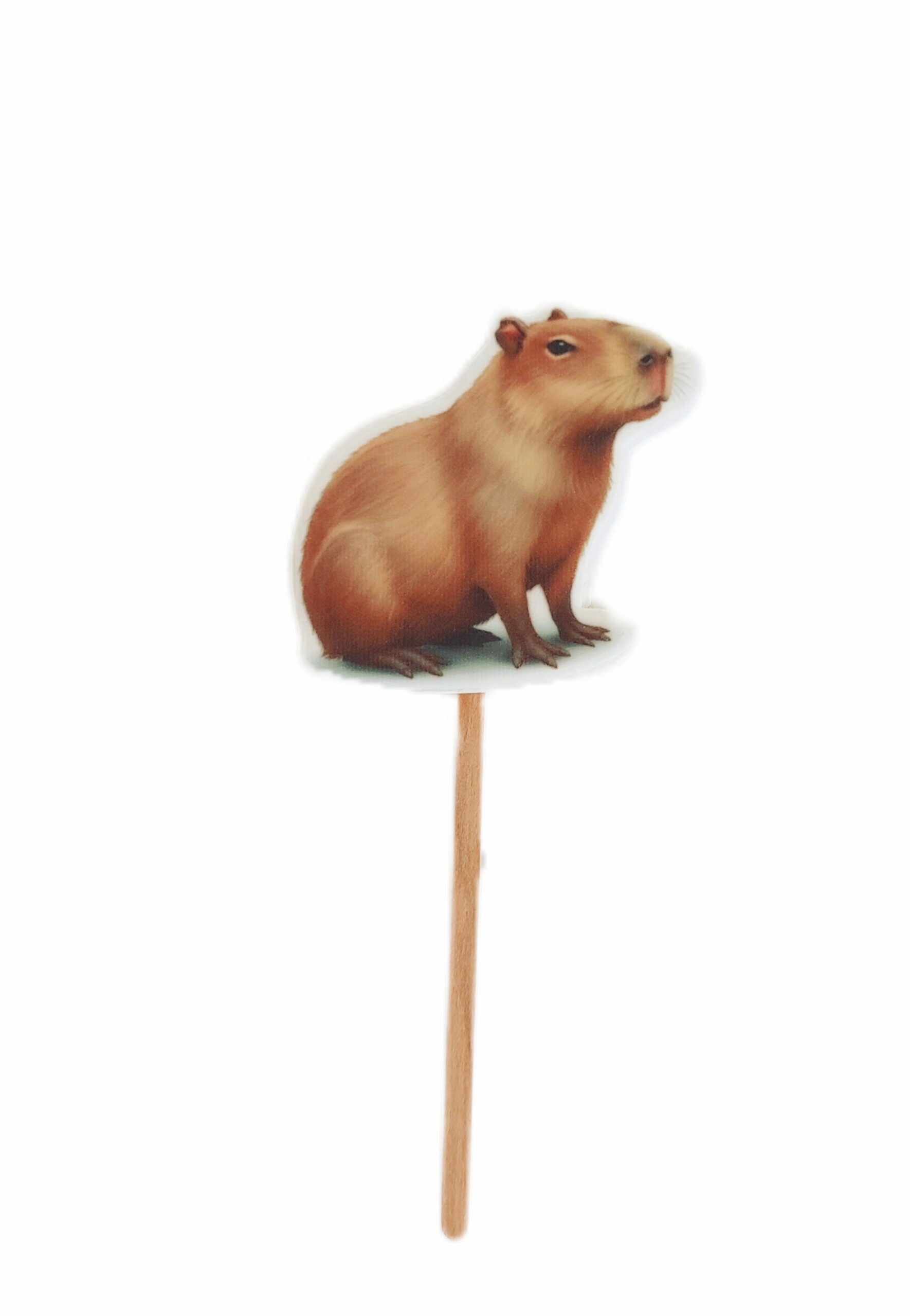 Topper cukrowy/lizak 2D „Kapibara” 1 szt nadrukowany na masie cukrowej z drewnianym patyczkiem jest bardzo dobrym i tańszym zamiennikiem figurek cukrowych i opłatka na tort