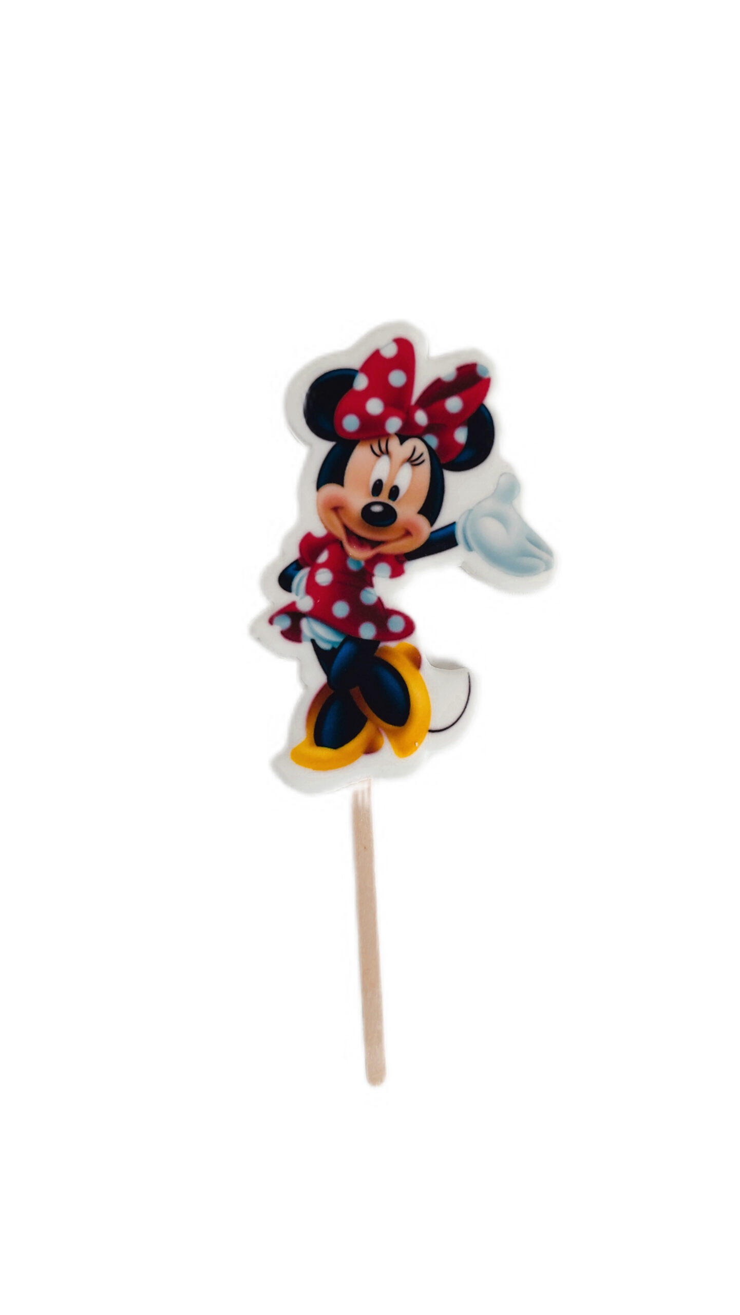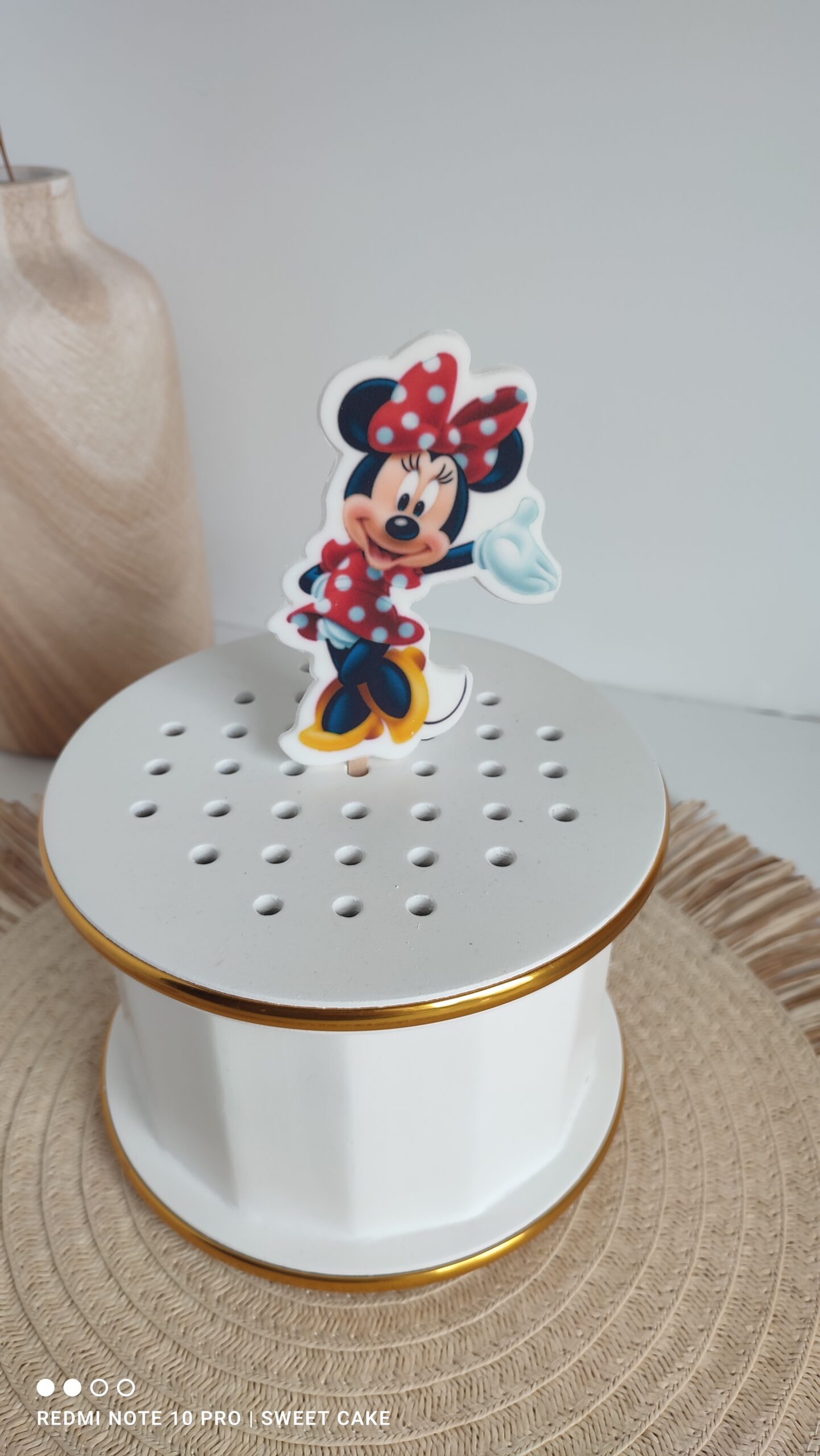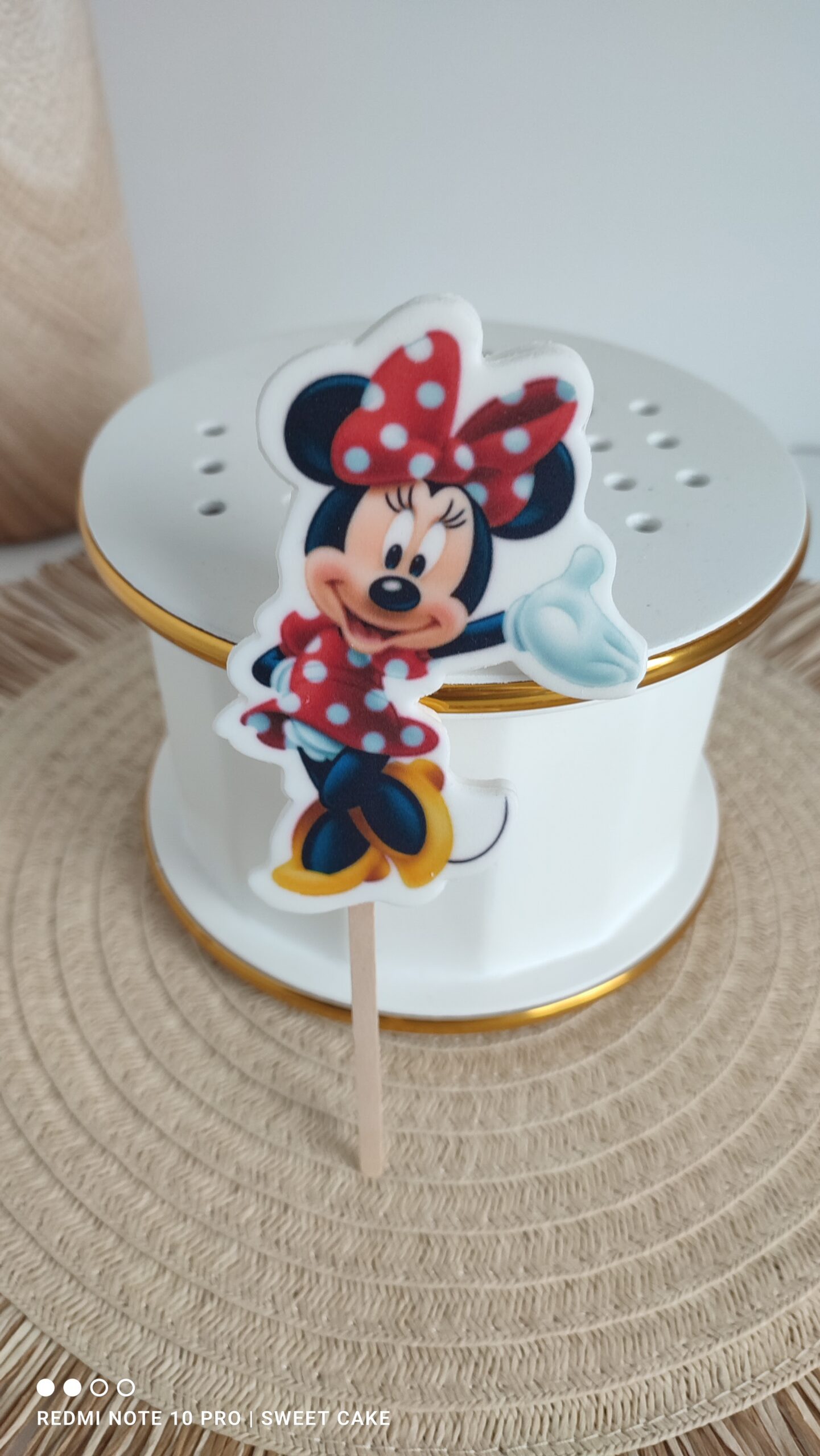 „Topper/Tabliczka cukrowy 2D „myszka MINI” 1 szt nadrukowany na masie cukrowej z drewnianym patyczkiem jest bardzo dobrym i tańszym zamiennikiem figurek cukrowych i opłatka na tort