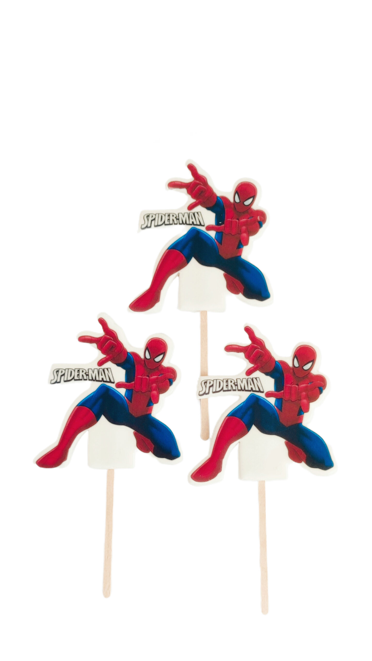 Topper/Tabliczka cukrowy 2D „SPIDERMAN” 1 szt nadrukowany na masie cukrowej z drewnianym patyczkiem jest bardzo dobrym i tańszym zamiennikiem figurek cukrowych i opłatka na tort