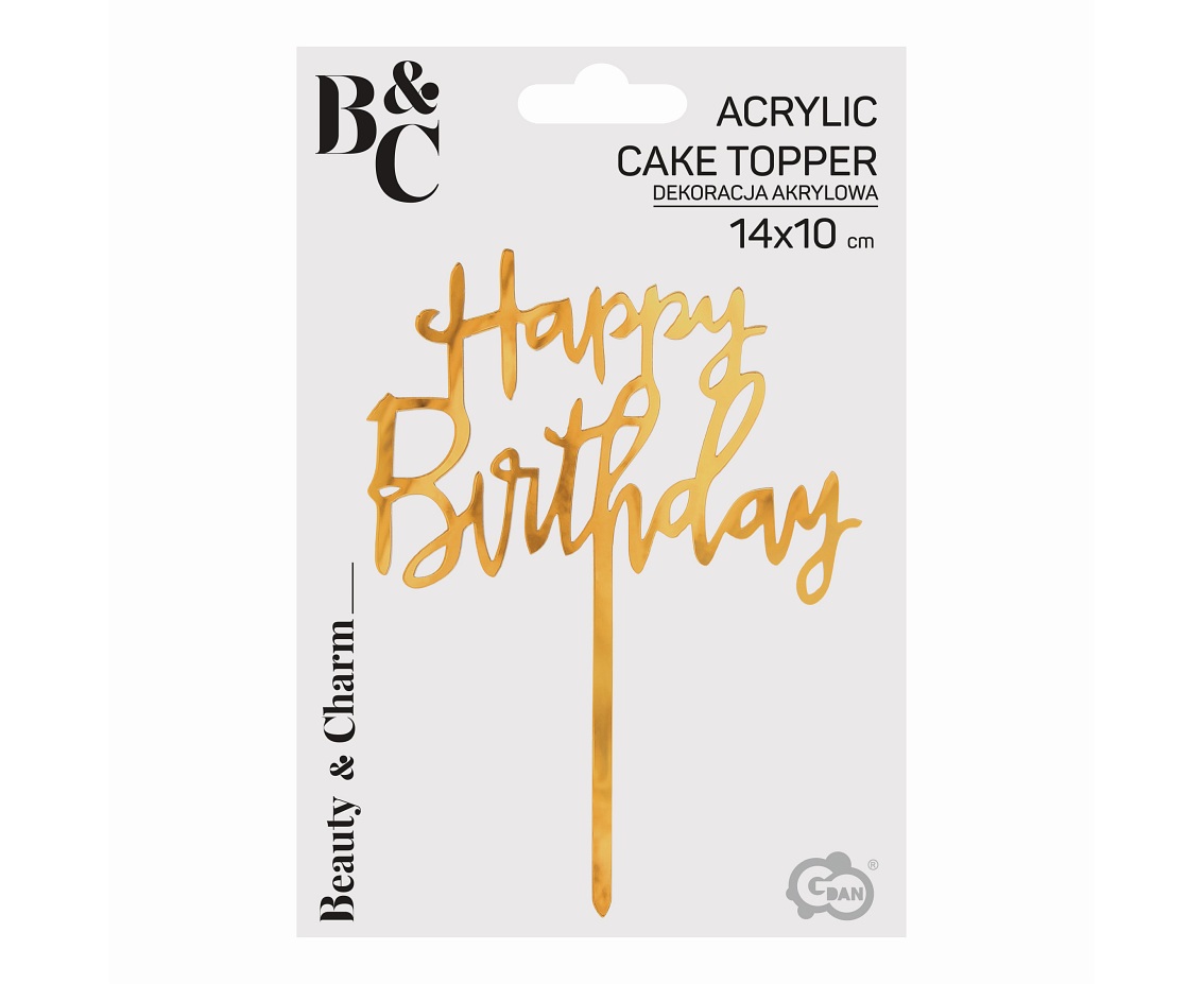 Dekoracja akrylowa na tort Happy Birthday, złota, 11×15 cm