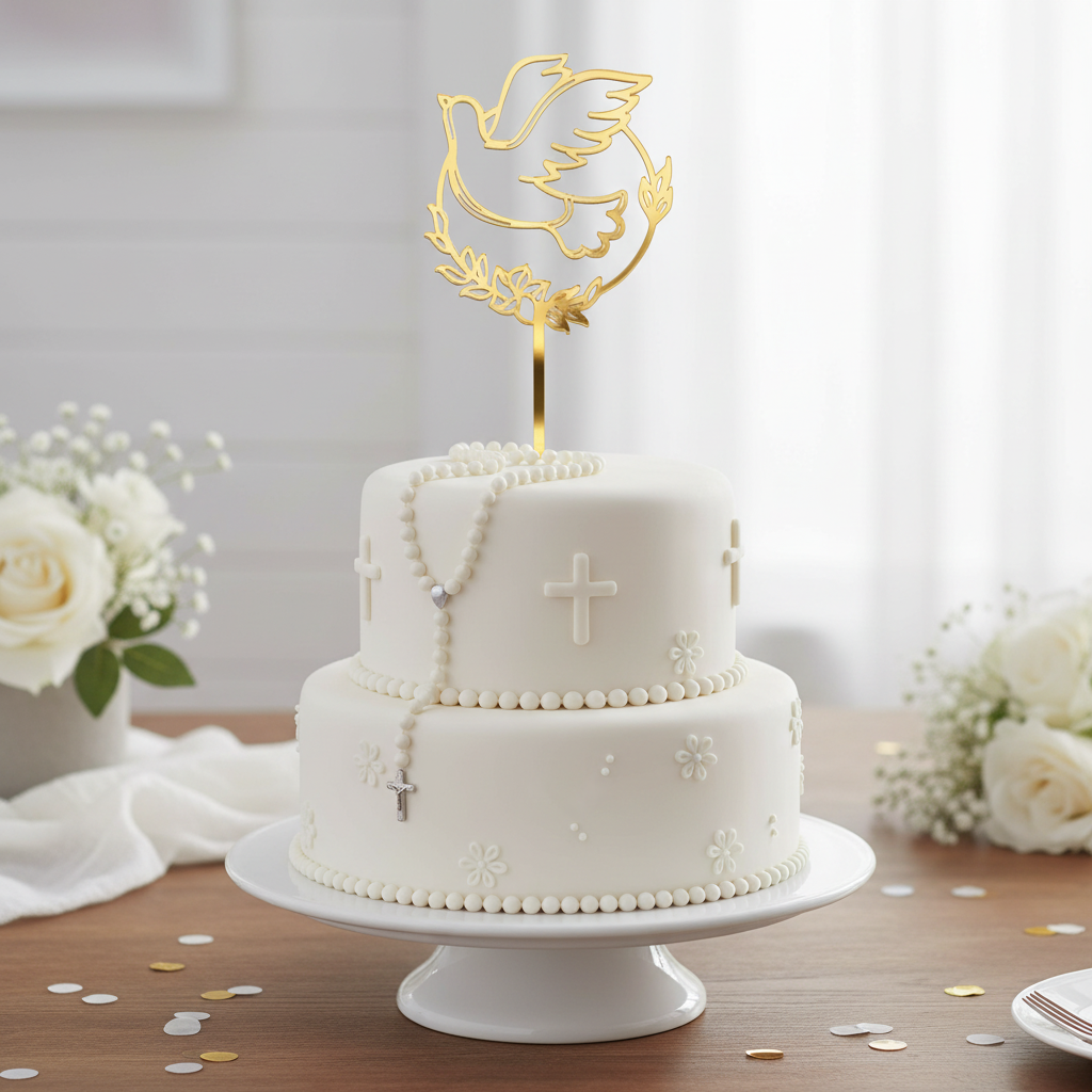 Topper na tort jednostronny w kolorze złotym, który tworzy Gołąb wpisany w okrąg z motywem roślinnym. Wspaniały dodatek do tortu komunijnego.