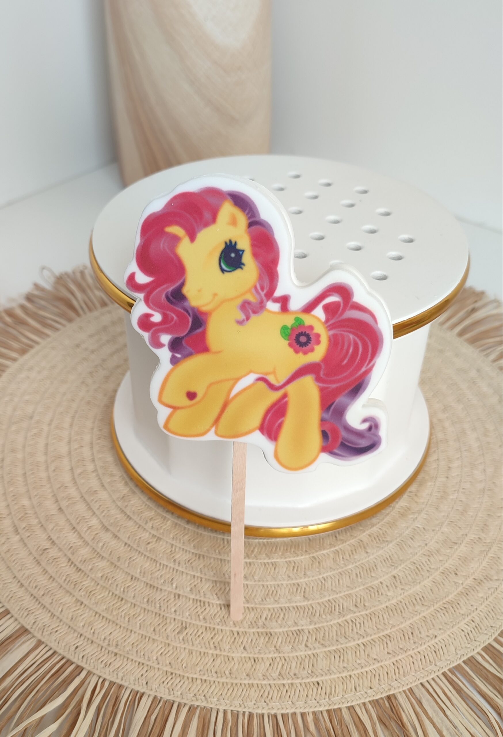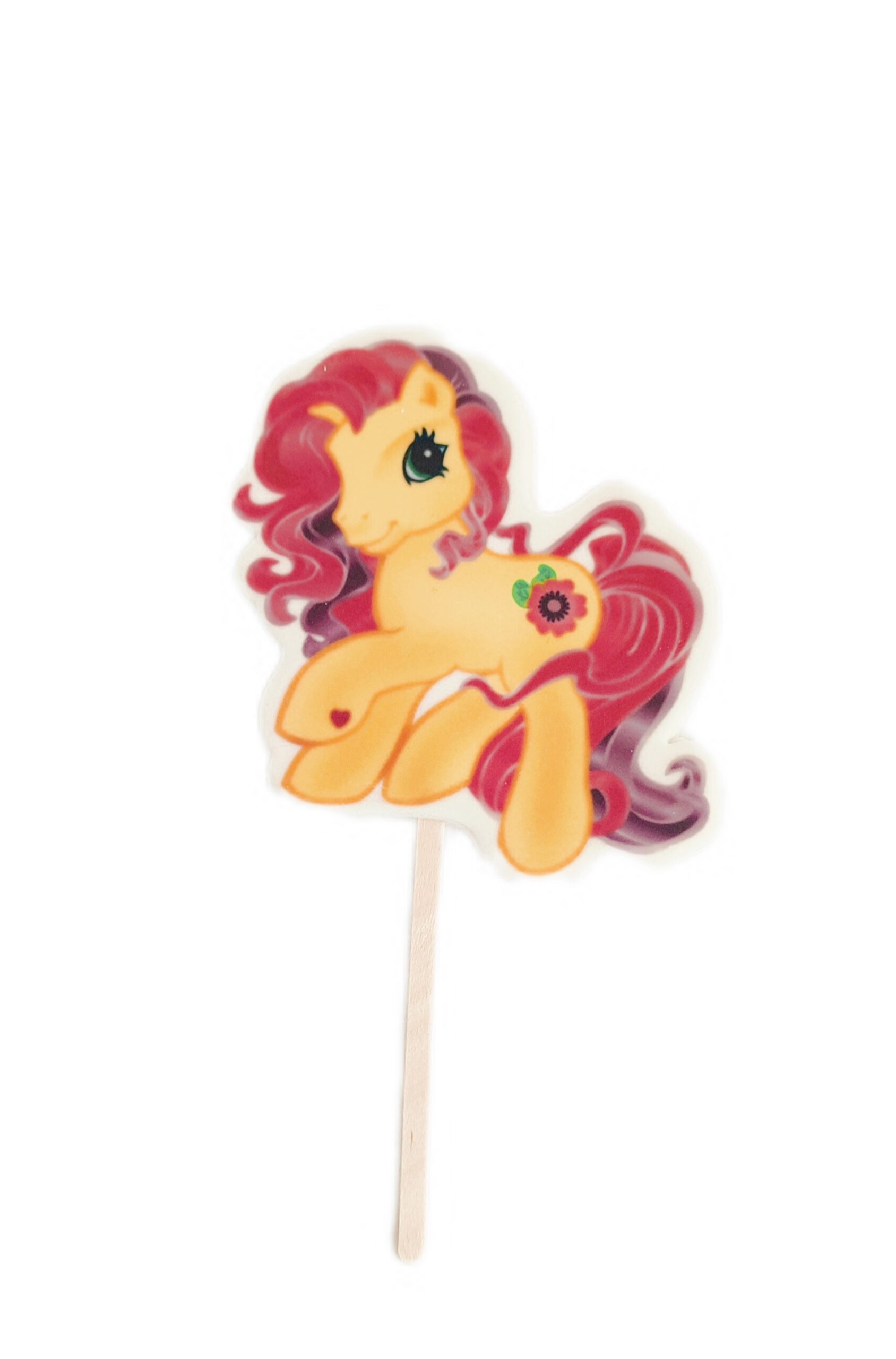 DeKoracja – Topper/Tabliczka cukrowy 2D ” KUCYK PONI „4” – 1 szt nadrukowany na masie cukrowej z drewnianym patyczkiem jest bardzo dobrym i tańszym zamiennikiem figurek cukrowych i opłatka na tort