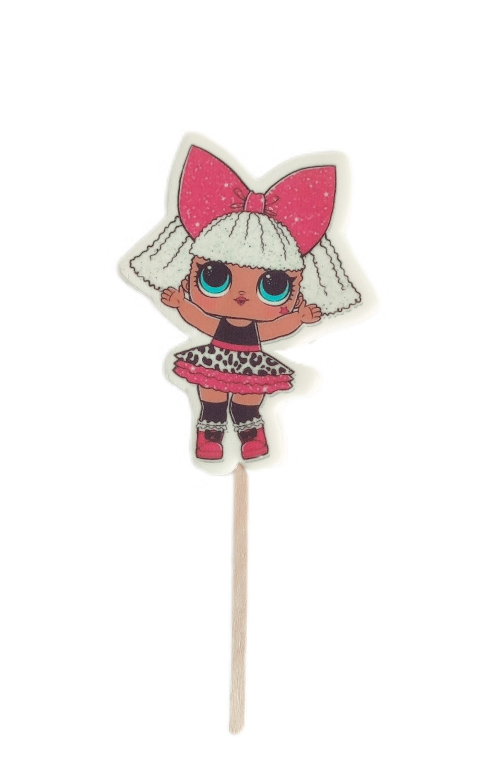 Topper cukrowy/lizak 2D „LOLKA 1” 1 szt nadrukowany na masie cukrowej z drewnianym patyczkiem jest bardzo dobrym i tańszym zamiennikiem figurek cukrowych i opłatka na tort
