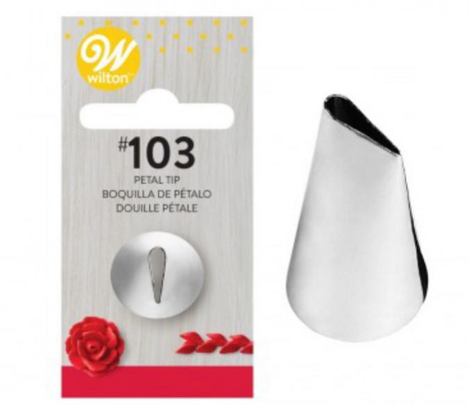 Tylka cukiernicza Wilton #103 PŁATEK to wysokiej jakości metalowa końcówka do dekoracji ciast i słodkości, wykonana ze stali nierdzewnej pokrytej stopem niklu i mosiądzu, co zapobiega rdzewieniu i zapewnia trwałość na długie lata. Ma kształt płatka, umożliwiając tworzenie dekoracji w postaci płatków róż, falbanek, wstążek, kokardek i szlaczków. Jest idealna do użycia z kremami, masami, bitą śmietaną i bezą.