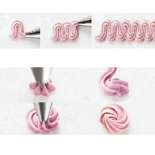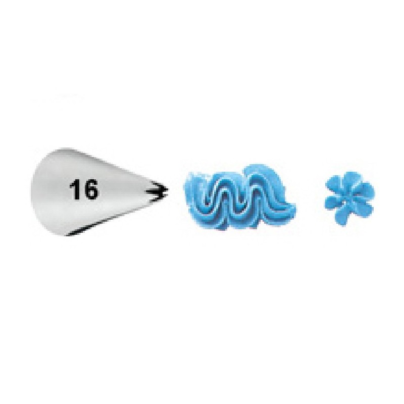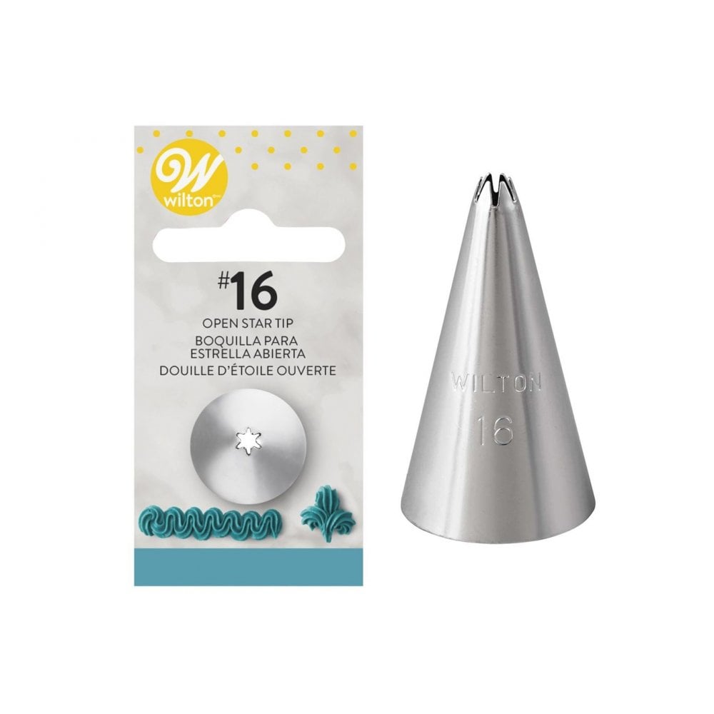 Tylka #16 otwarta gwiazdka Wilton to metalowa, dekoratorska końcówka wykonana ze stali nierdzewnej, służąca do precyzyjnego dekorowania kremem, lukrem, polewą czy bitą śmietaną. Średnica podstawy wynosi około 16-18 mm, a otworu około 3-4 mm. Tylka pozwala na tworzenie ozdób w kształcie gwiazdek, rozetek, muszelek, zygzaków czy fal, doskonale nadaje się do dekoracji tortów, ciastek, muffinek i cupcake’ów. Można ją stosować samodzielnie lub z adapterem (couplerem) ułatwiającym zmianę tylek w rękawie cukierniczym. Produkt jest pokryty powłoką zapobiegającą rdzewieniu i zaleca się mycie ręczne, choć niektóre modele można myć w górnym koszu zmywarki. Tylka ma około 3 cm wysokości i jest srebrna kolorystycznie