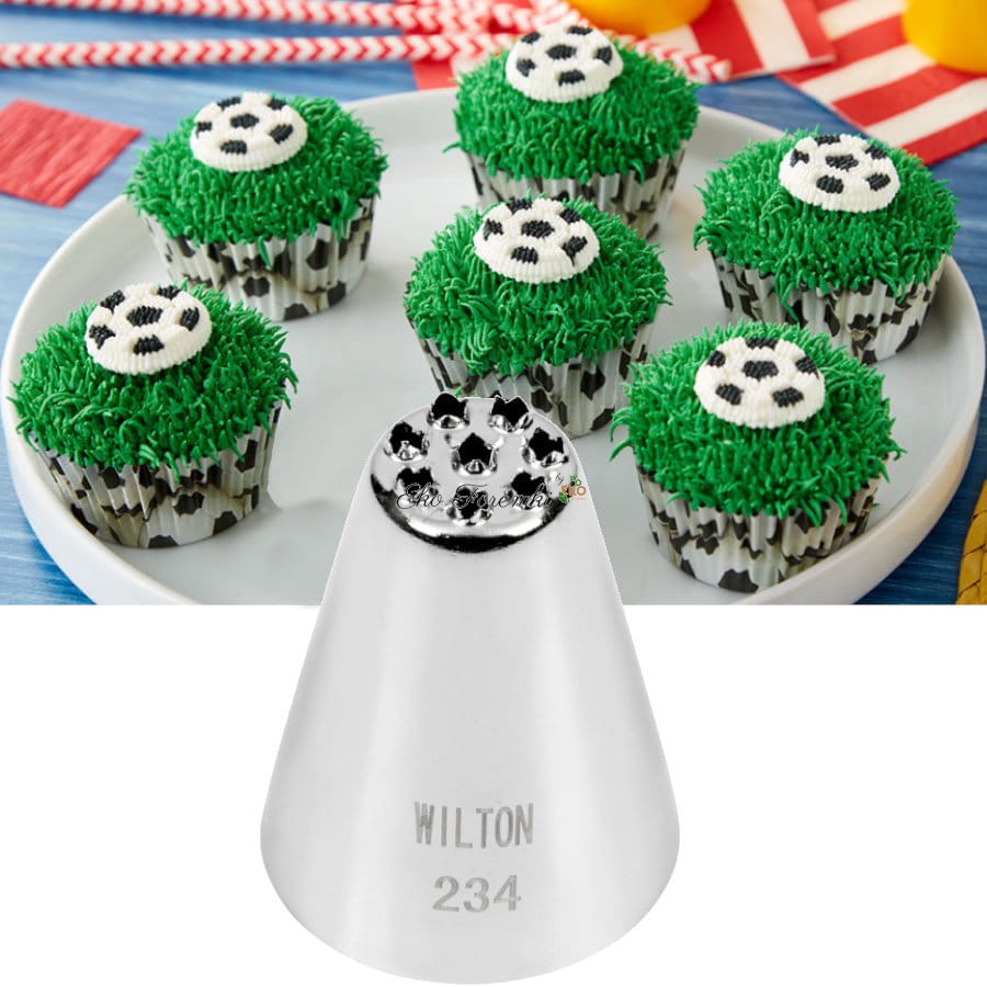 Tylka cukiernicza #234 firmy Wilton to duża, specjalna końcówka dekoratorska przeznaczona do tworzenia dekoracji imitujących trawę, włosy, futro oraz środki kwiatów na tortach, babeczkach i ciasteczkach. Wykonana jest z wysokiej jakości stali nierdzewnej, dodatkowo pokrytej stopem niklu i mosiądzu, co zapobiega rdzewieniu i ułatwia czyszczenie, choć zaleca się mycie ręczne. Tylka ma osiem otworów w kształcie otwartej gwiazdki, dzięki którym można szybko i efektownie formować wiele cienkich strużek kremu jednocześnie. Jej średnica podstawy wynosi około 27-32 mm, a wysokość około 35-40 mm. Nadaje się do stosowania z kremami maślanymi, śmietankowymi, czekoladowymi, lukrem czy bitą śmietaną. Pasuje do dużego adaptera i jest świetnym narzędziem do dekorowania wypieków o tematyce naturalnej lub „potworkowej