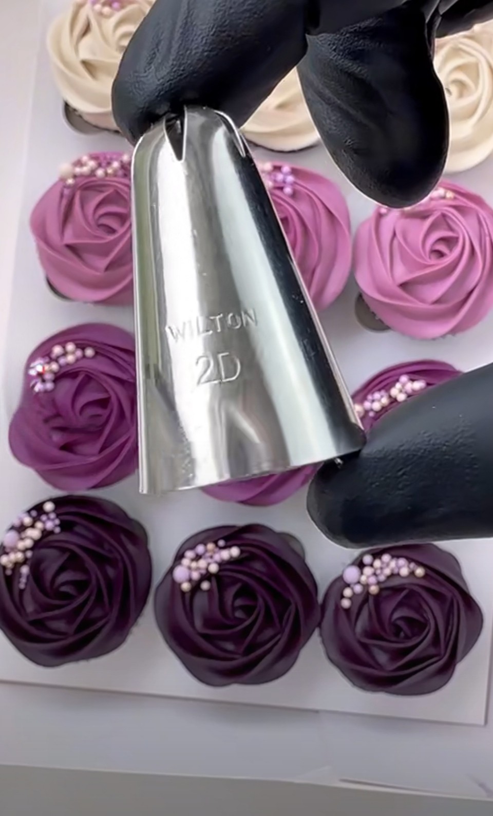 Tylka #2D kwiat Róża Wilton to metalowa końcówka dekoratorska wykonana ze stali nierdzewnej, przeznaczona do tworzenia pięknych dekoracji w kształcie kwiatów, szczególnie róż, na tortach, babeczkach i innych wypiekach. Jej charakterystyczny kształt gwiazdki zamkniętej umożliwia wyciskanie masy kremowej ruchem okrężnym od środka do zewnątrz, dzięki czemu powstaje efekt realistycznej róży. Tylka pasuje do każdego rękawa cukierniczego i można ją mocować na adapterze (coupler), co ułatwia pracę.