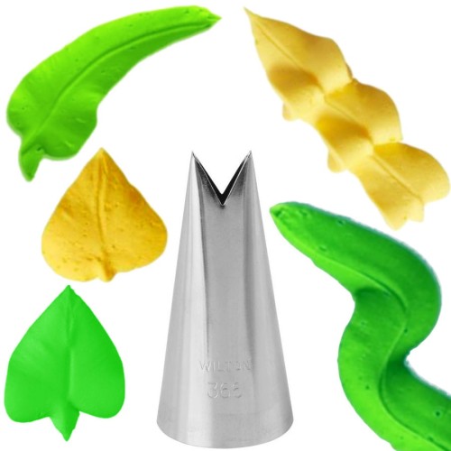 Tylka cukiernicza Wilton nr 366 „Liść Duży” to wysokiej jakości stalowa końcówka do rękawów cukierniczych, przeznaczona do tworzenia dekoracji w kształcie dużych liści oraz szlaczków, falbanek i płatków kwiatów na tortach i babeczkach. Wykonana jest ze stali nierdzewnej, pokrytej specjalnym stopem niklu i mosiądzu, co zapobiega rdzewieniu i zapewnia trwałość produktu. Tylka ma długość około 5 cm, średnicę podstawy około 25 mm, a szerokość otworu ok. 9,5-10 mm. Nadaje się do pracy z różnymi masami, kremami, bitą śmietaną i bezą, jest łatwa w myciu, a jej precyzyjny kształt pozwala uzyskać efekt naturalnego liścia.
