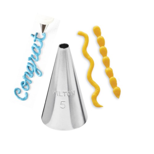 Tylka okrągła nr 5 Wilton to profesjonalna końcówka dekoratorska wykonana ze stali nierdzewnej, pokrytej stopem niklu i mosiądzu, co zapobiega rdzewieniu i zapewnia trwałość na długie lata użytkowania. Ma średnicę otworu około 3 mm, długość około 3 cm oraz średnicę podstawy około 1,7 cm. Idealnie nadaje się do precyzyjnego pisania i dekorowania różnorodnych wypieków, takich jak babeczki, ciasteczka, ciasta, a także do tworzenia koralików, koronek, linii, kropek i wielu innych ozdób. Pasuje do standardowych rękawów cukierniczych marki Wilton i można ją stosować do mas, kremów, bitej śmietany oraz bezy. Łatwa do mycia, zaleca się mycie ręczne.