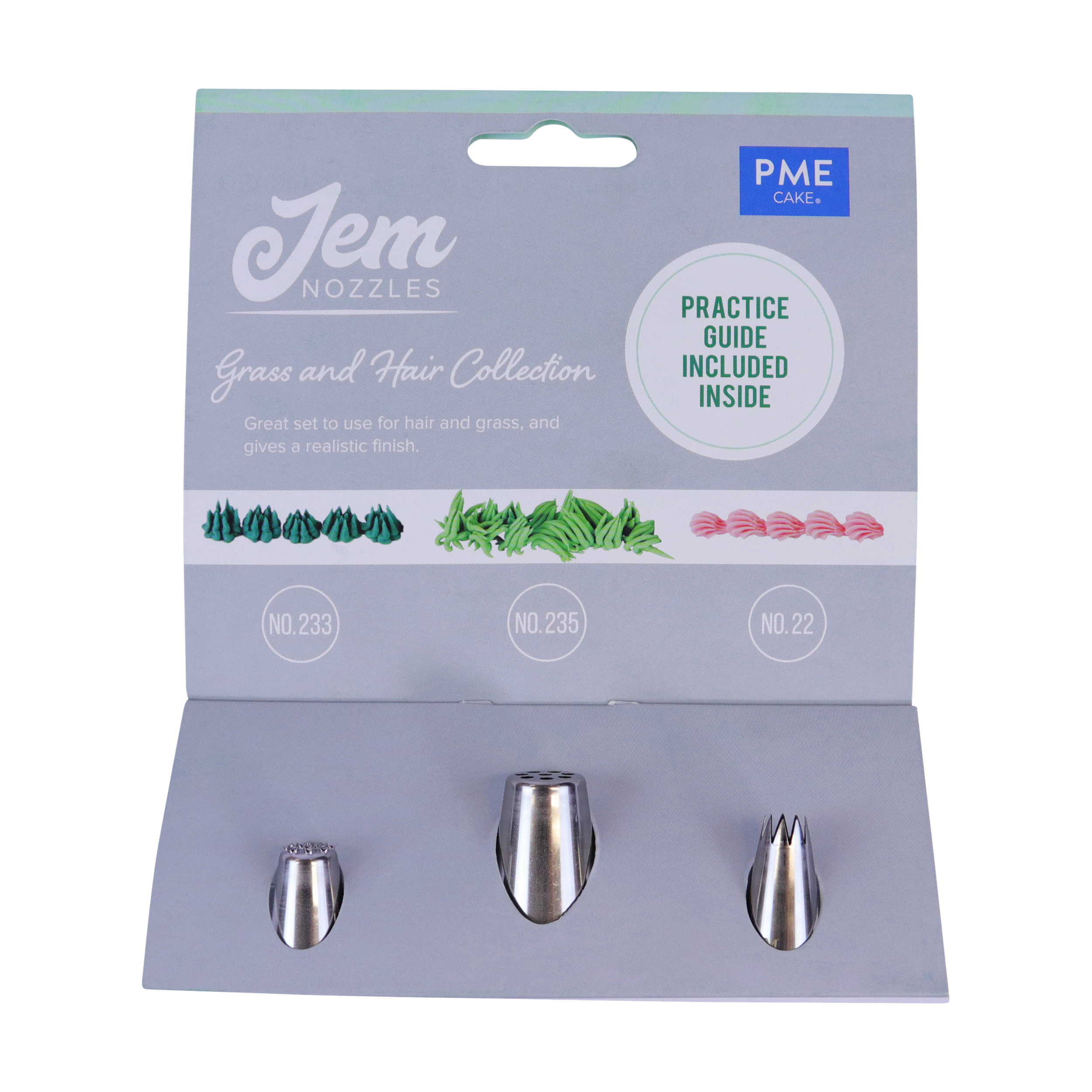 Zestaw zawiera: Dyszę nr 233 – do tworzenia realistycznej trawy do tortów o tematyce piłkarskiej i nie tylko; Dyszę nr 22 – do wyciskania spirali i muszelek z różnych mediów; Dyszę nr 235 – do tworzenia realistycznych włosów do ciast.
