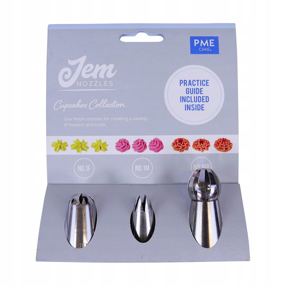 Zestaw zawiera: Dyszę nr 16T – przekręć i stwórz piękny wzór z falbanką; Dyszę nr M1 – idealny spiralny kształt do każdego ciasta; Dyszę nr 1F – wyciśnij kwiatek w kształcie kropli i udekoruj perełkami cukrowymi.